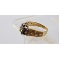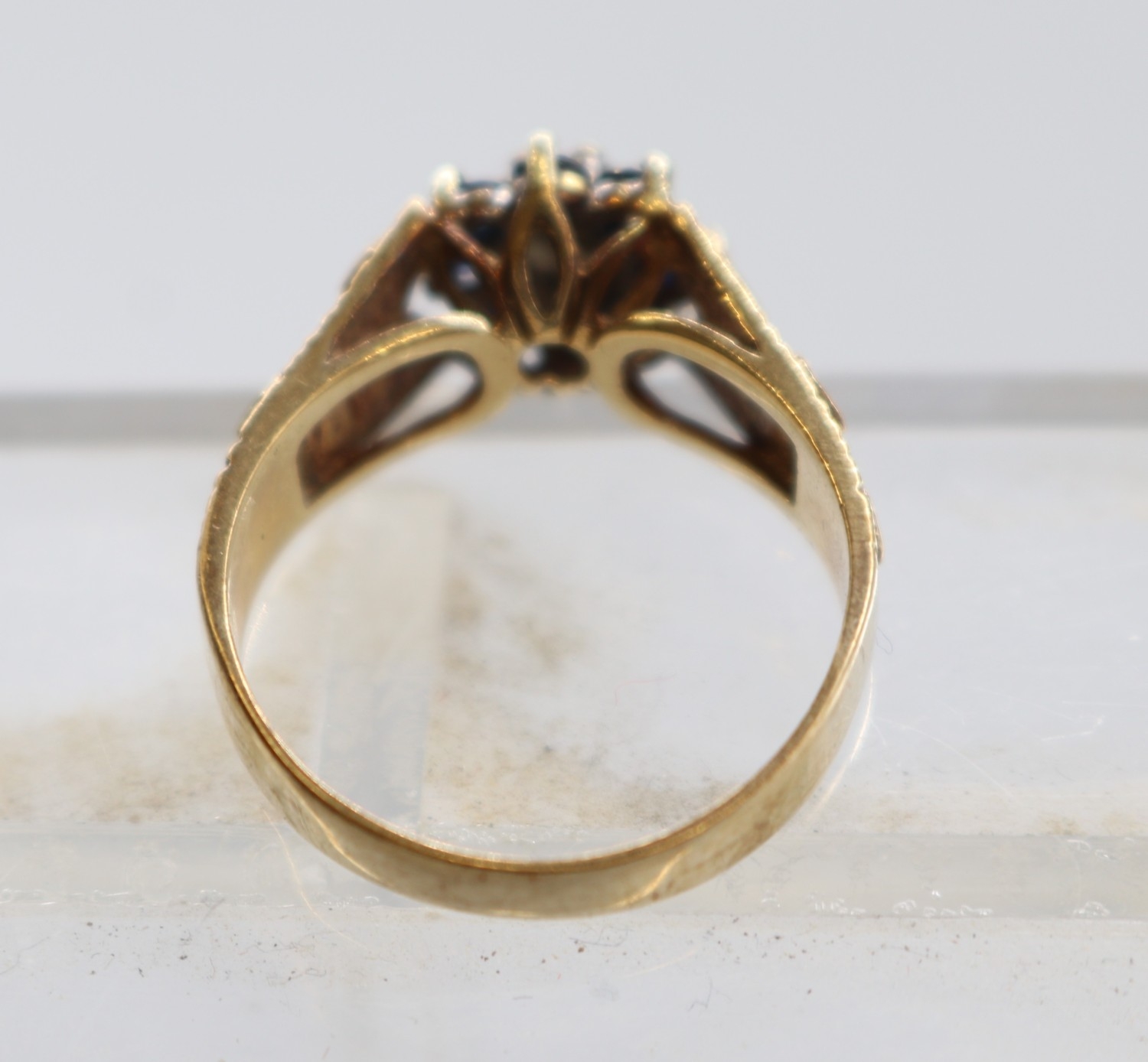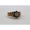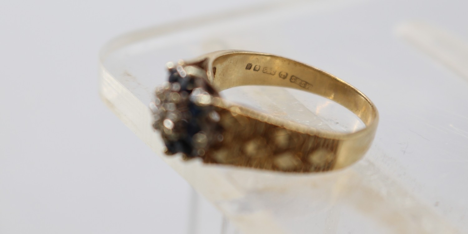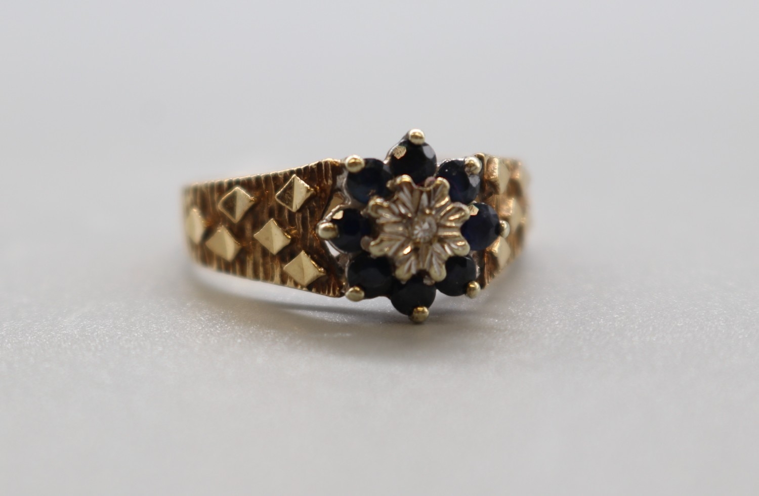 Hallmarked 9ct sapphire and diamond floral cluster ring by M S & S, size O, (3.4g)