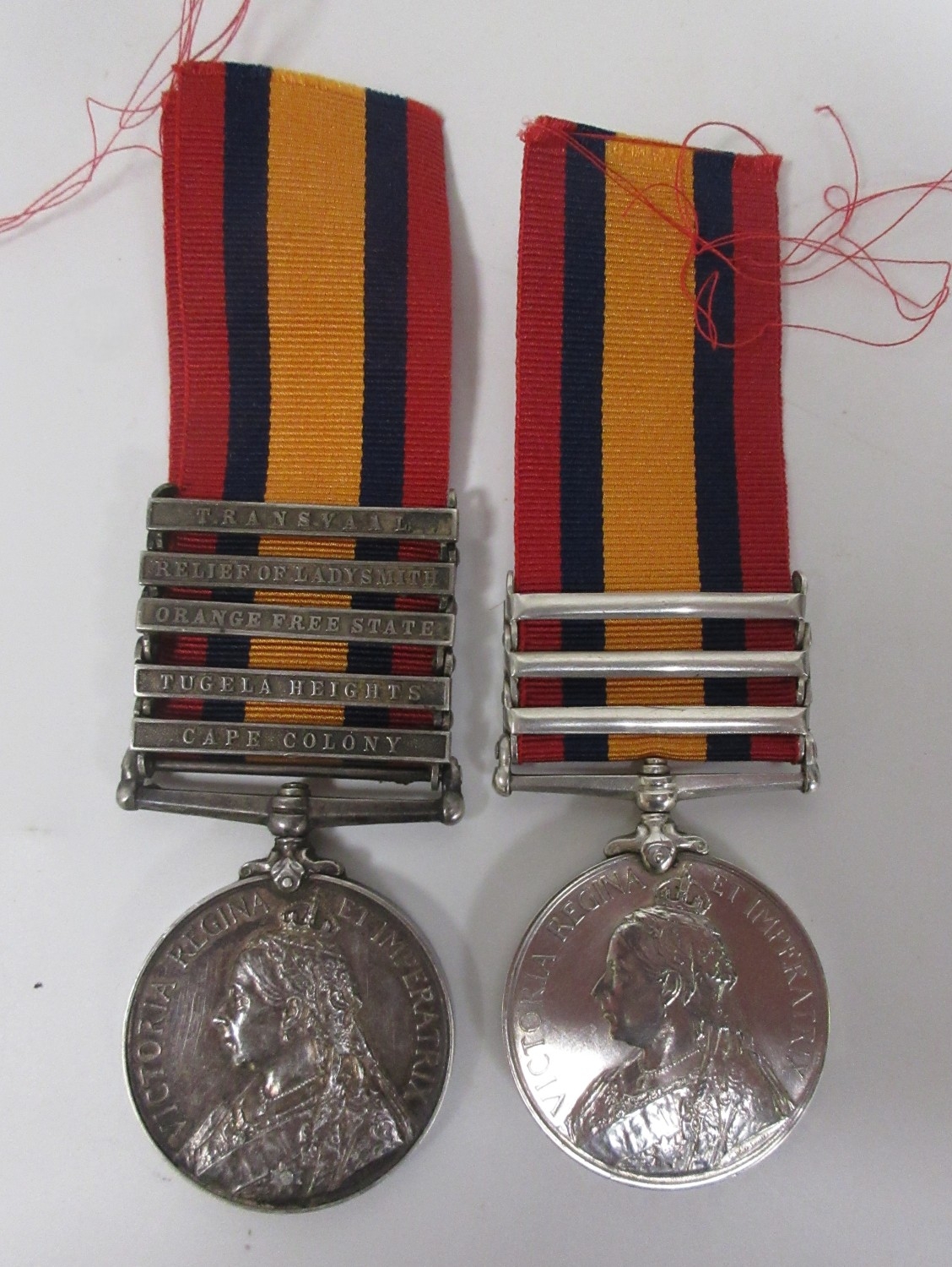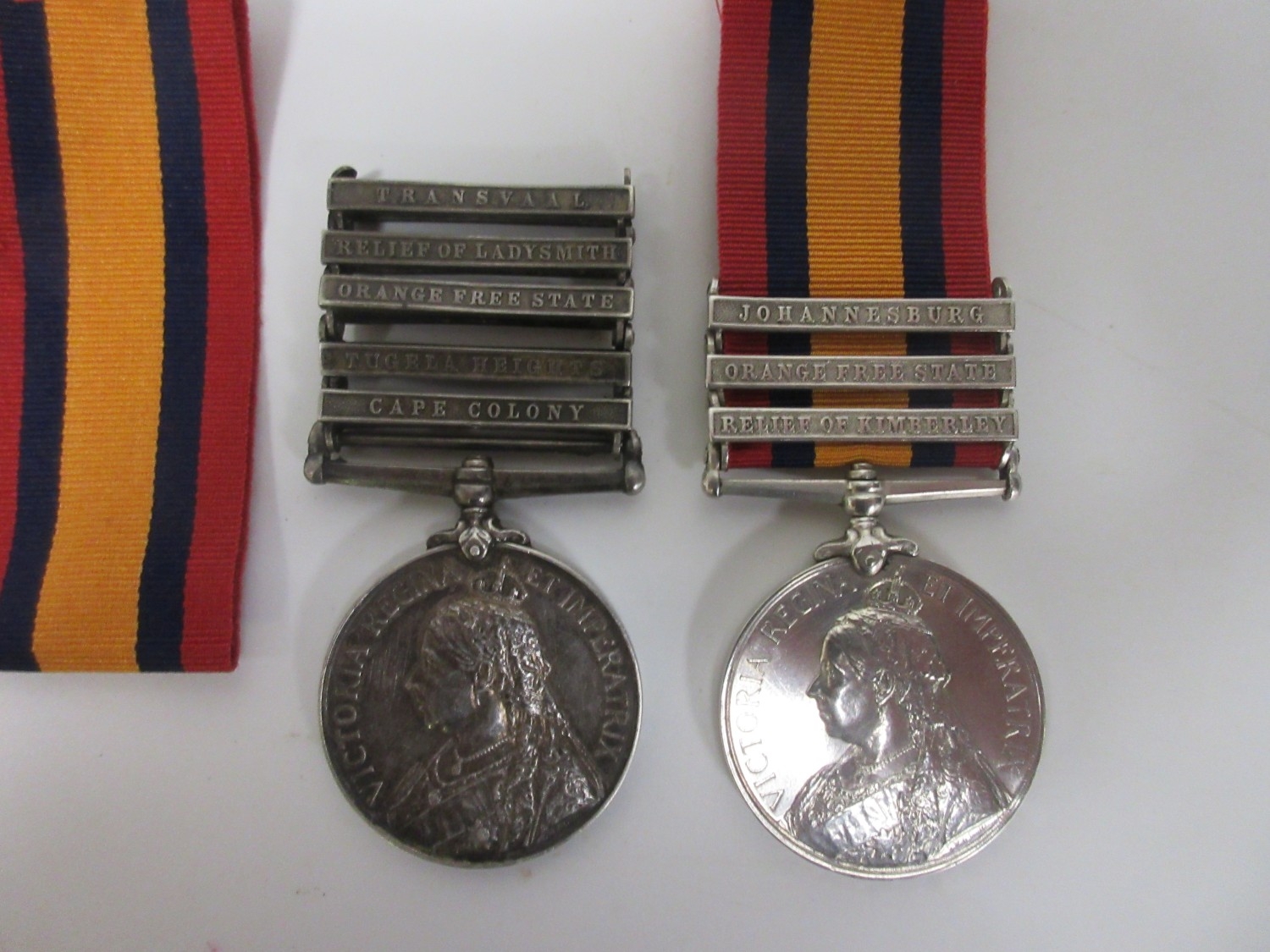 Queens South Africa Medal with five clasps, Transvaal, Relief of Ladysmith, Orange Free State, Tugela Heights, Cape Colony. To 5212 Pte J. Warner Somerset Light Infantry. QSA Medal with three clasps, Johannesburg, Orange Free State, Relief of Kimberley. To 249 Pte C. Nock N Stafford Regiment (with accompanying research)
