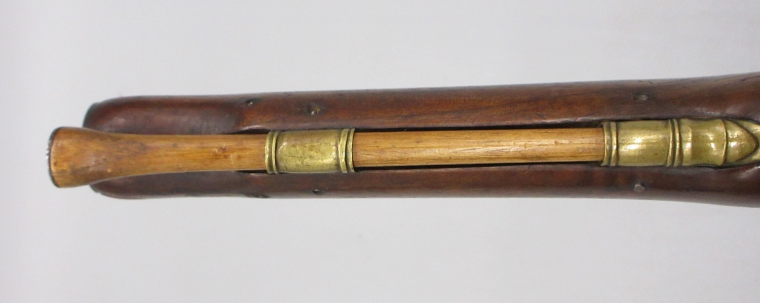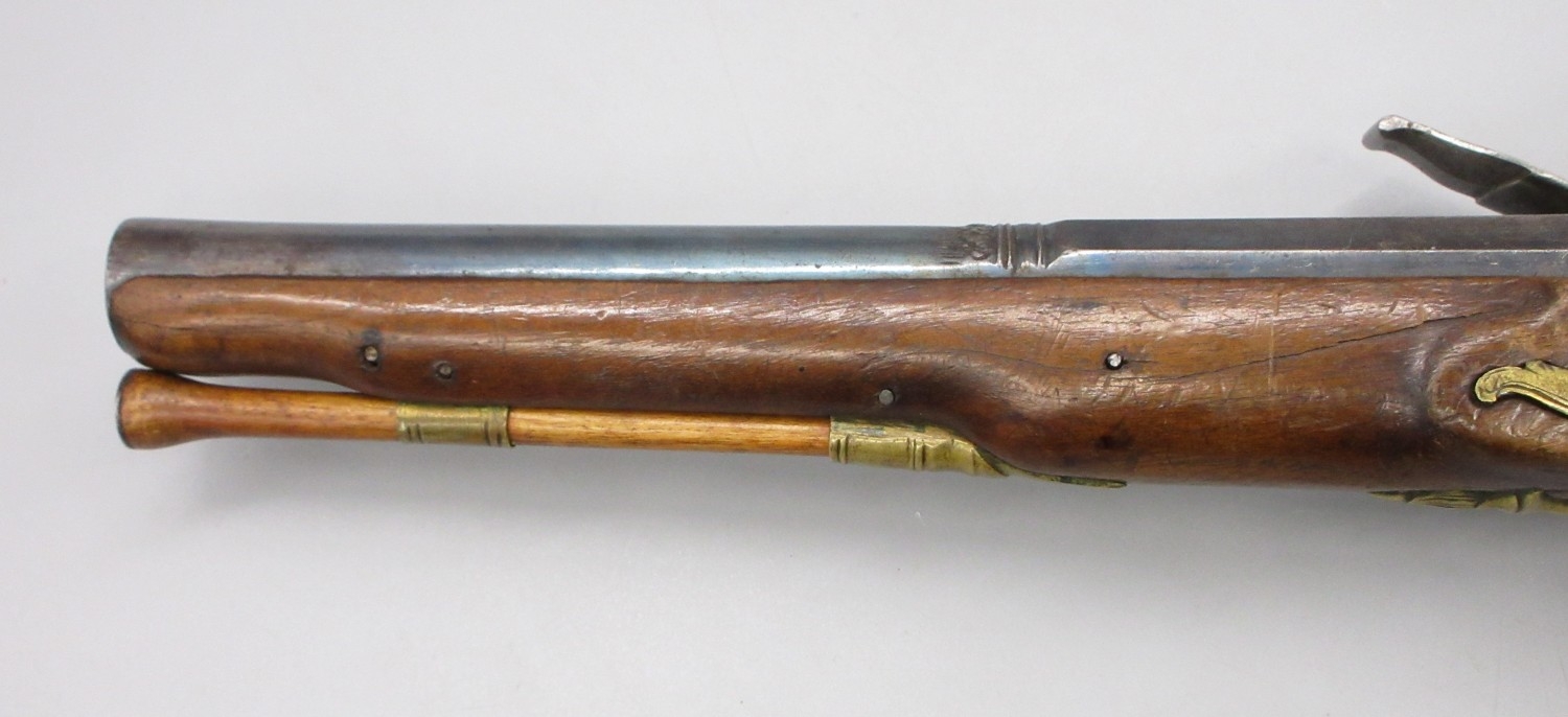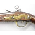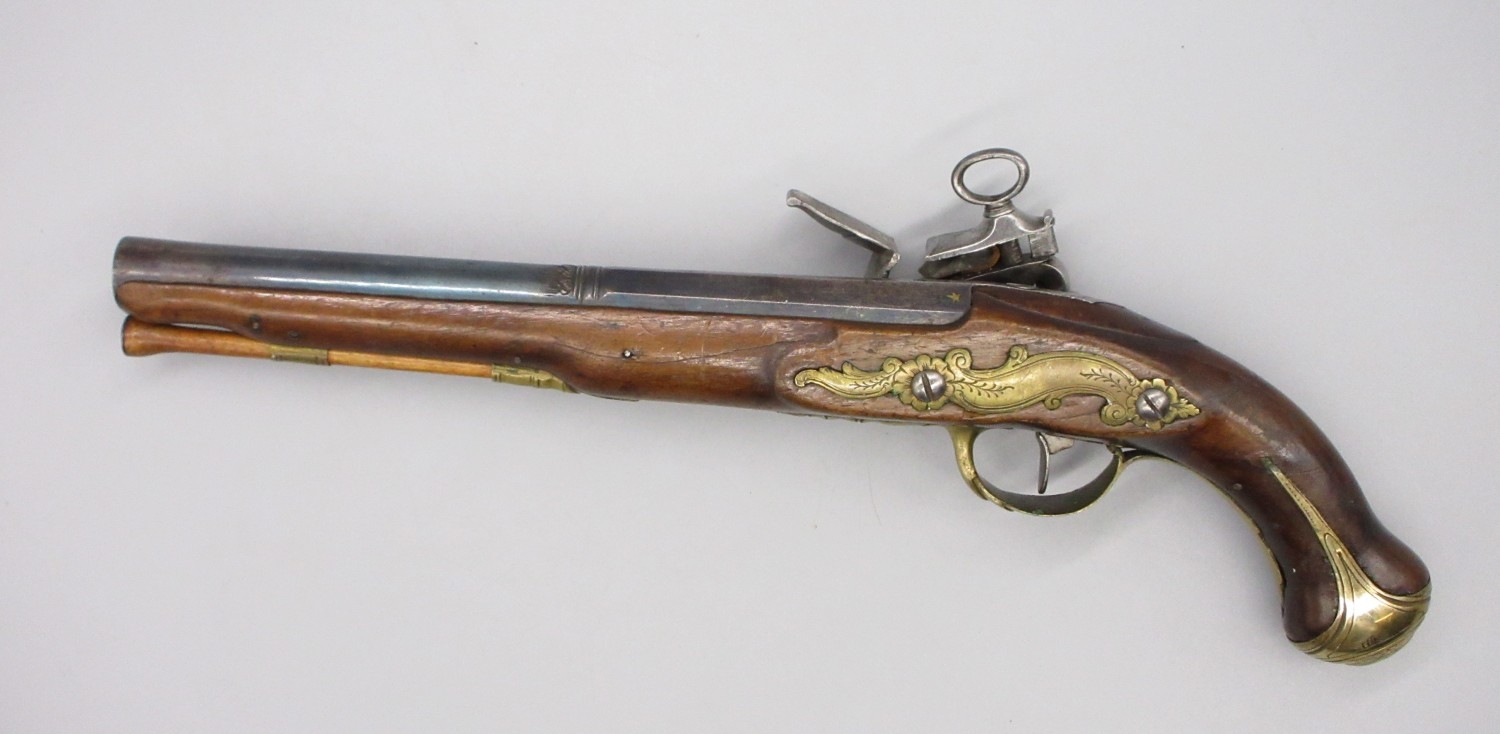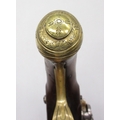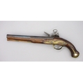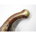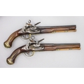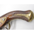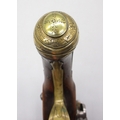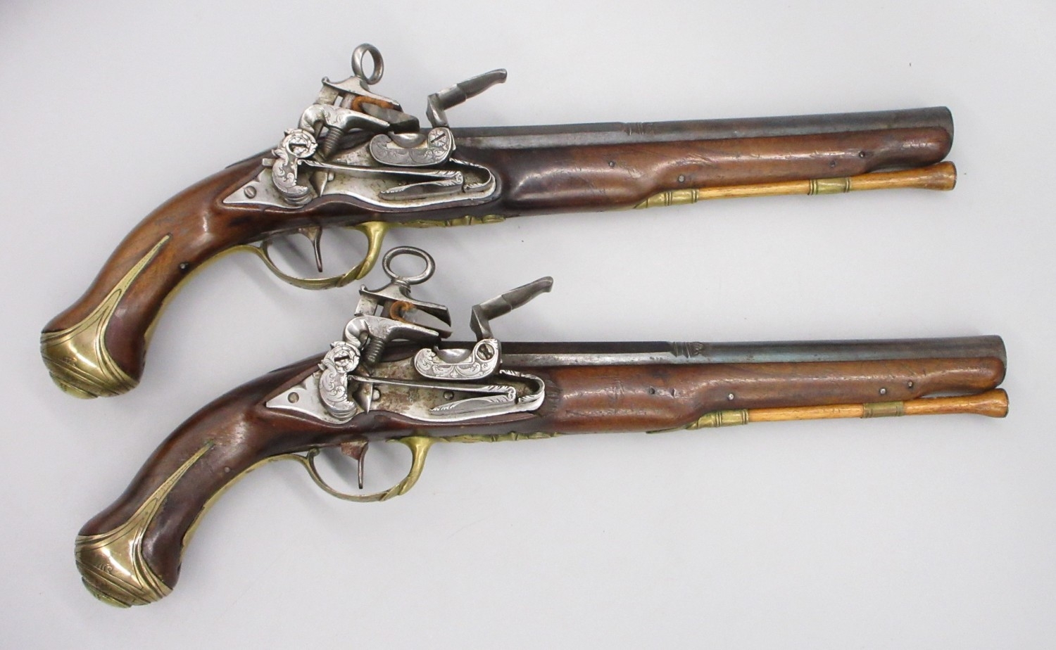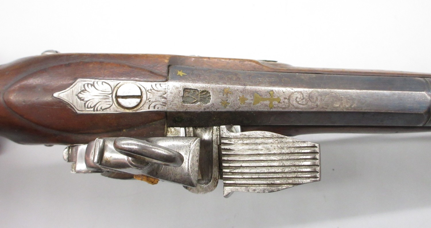 Pair of Spanish 16 bore Miquelet pistols, 9.5" staged half octagonal barrels with various stamped markings and inlaid detail, brass mounts, complete with ramrods, 38cm overall