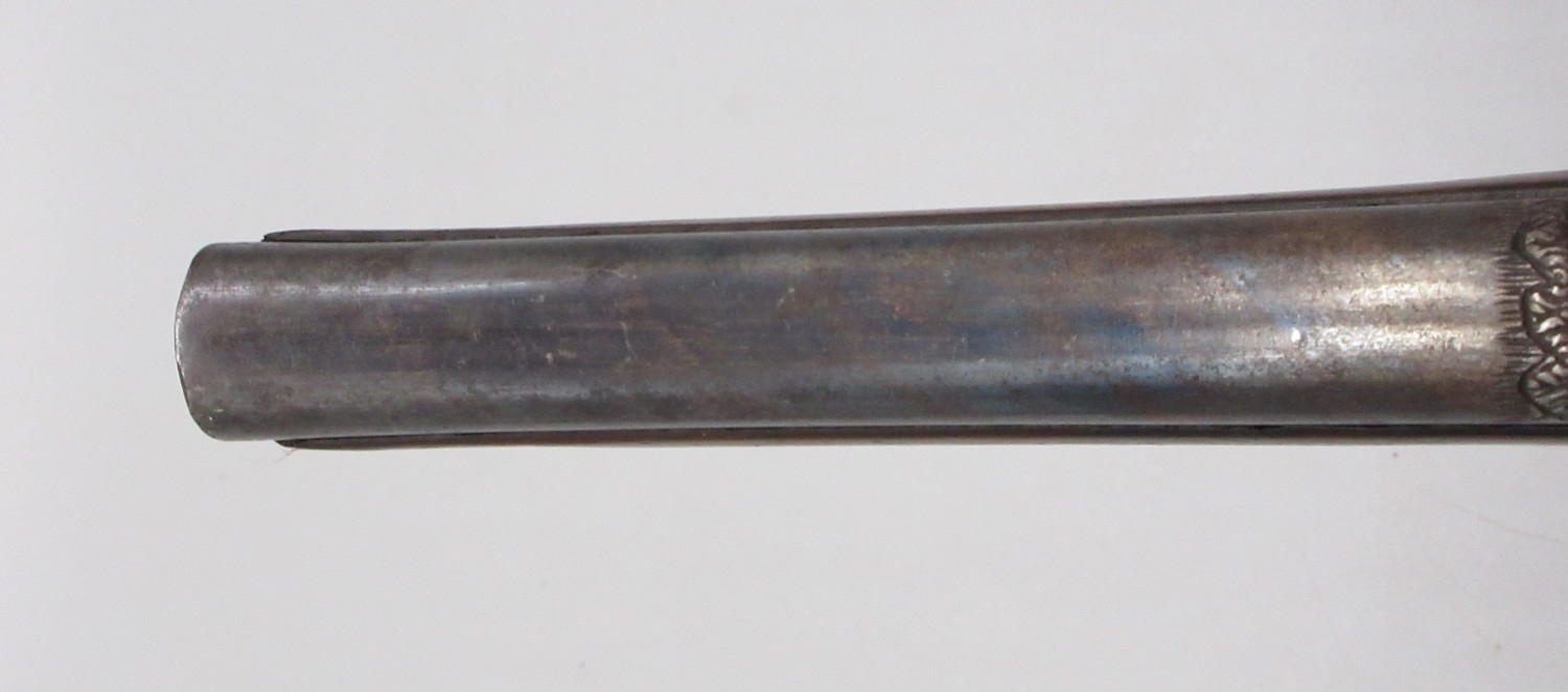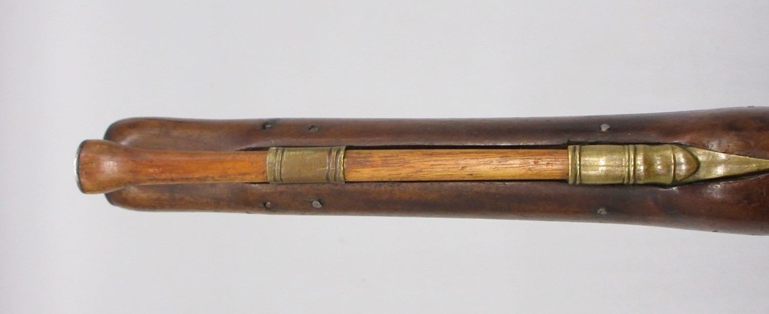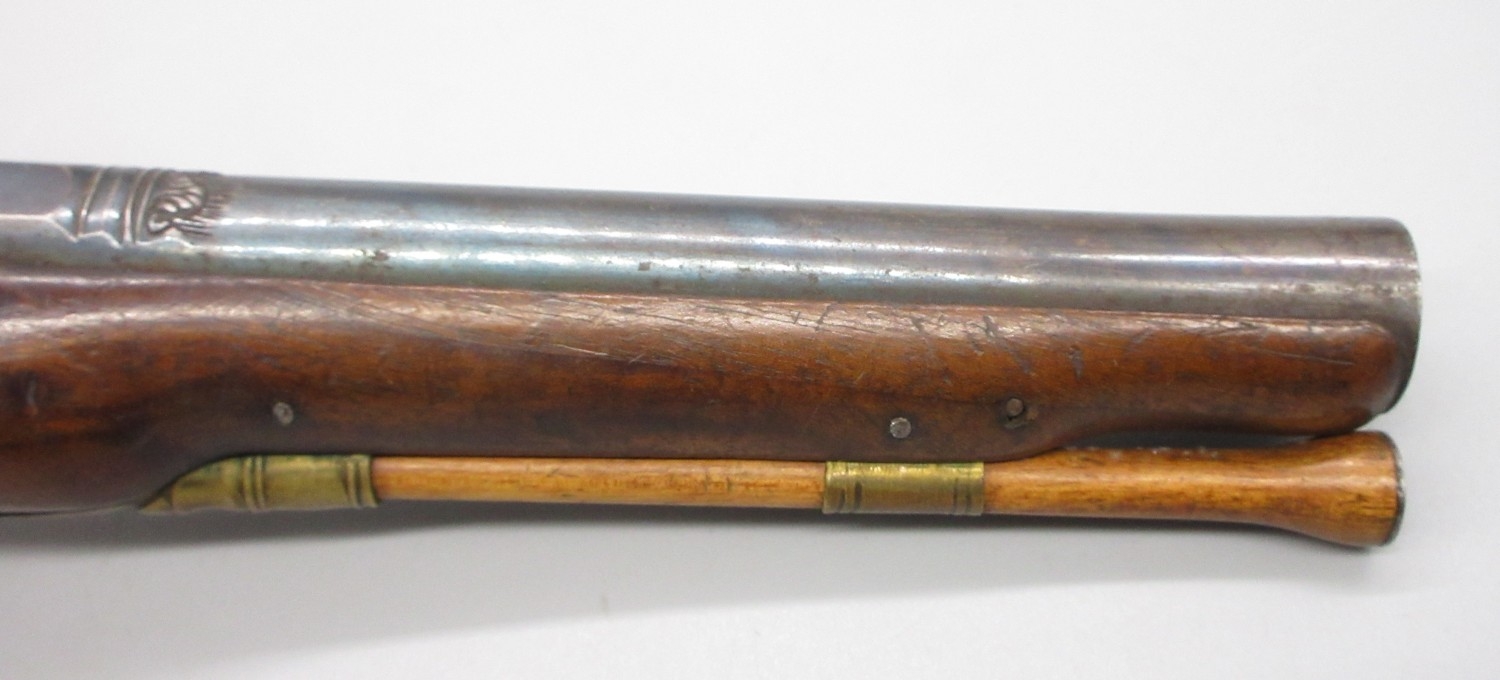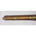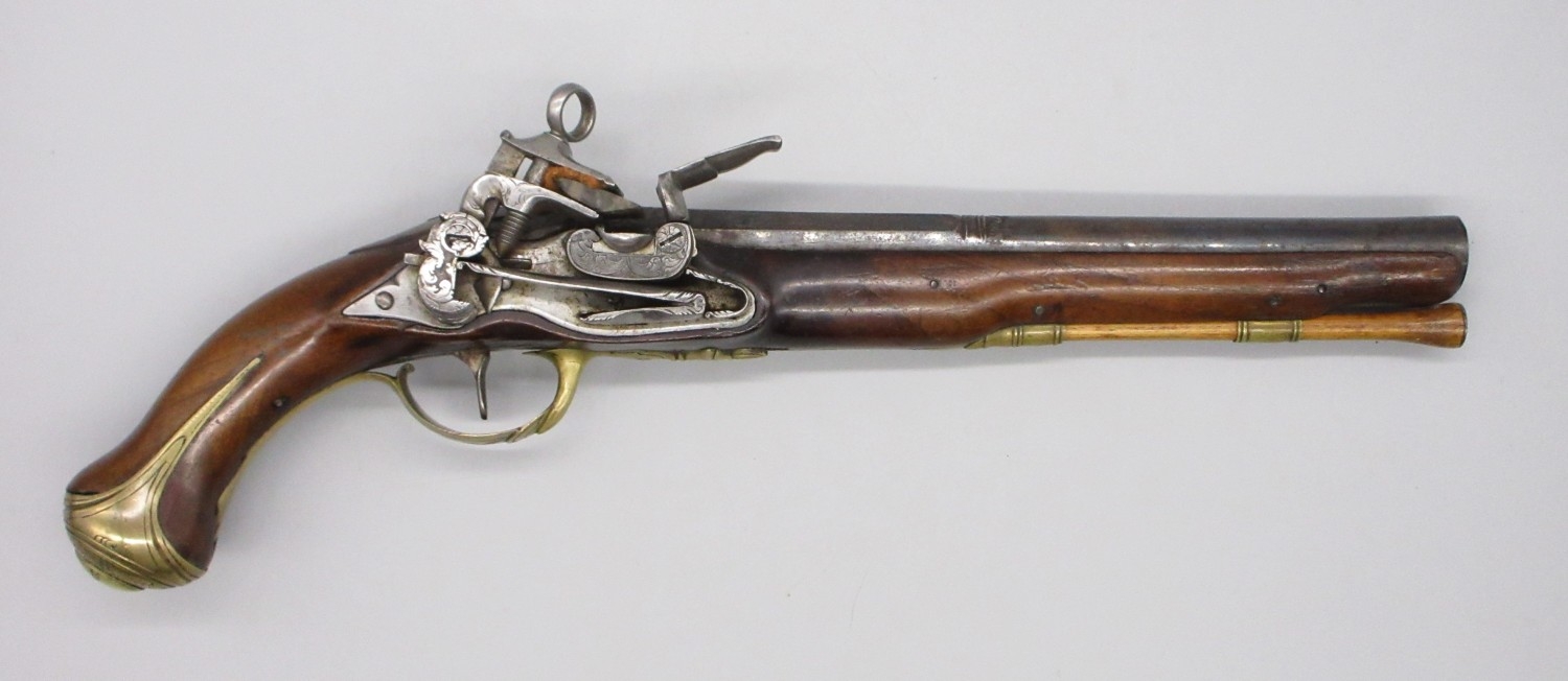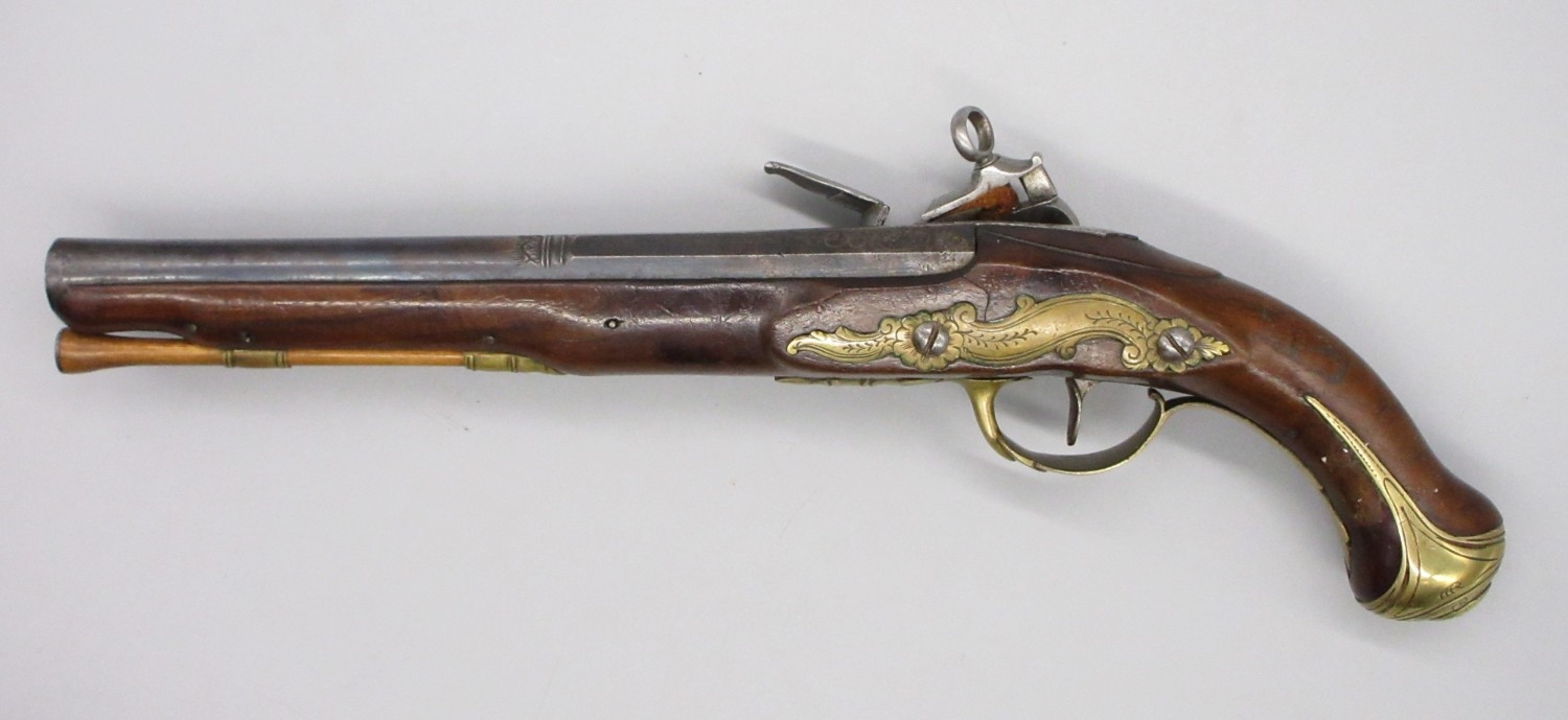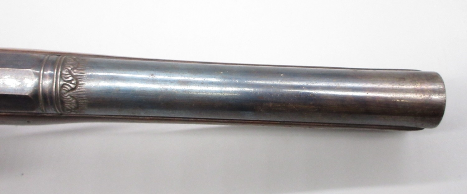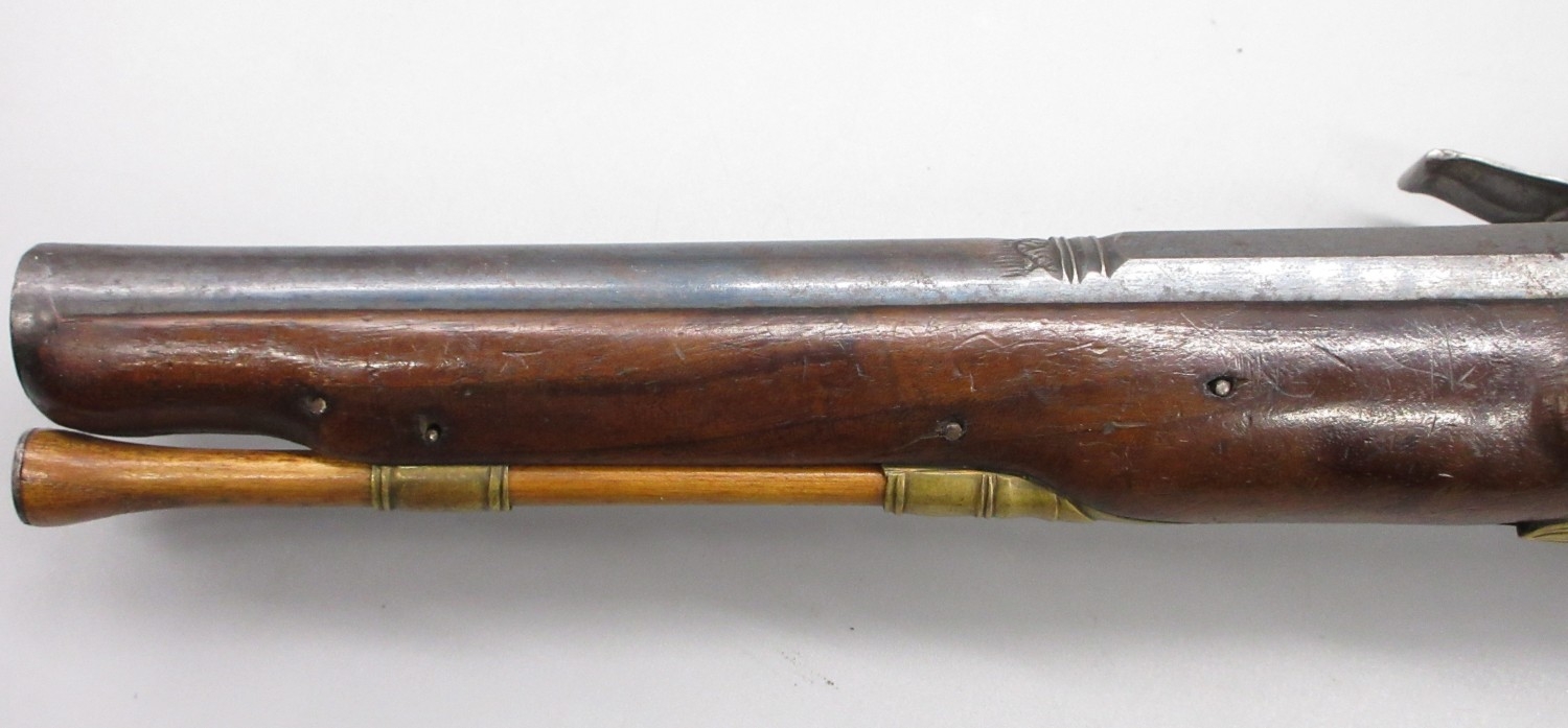 Pair of Spanish 16 bore Miquelet pistols, 9.5" staged half octagonal barrels with various stamped markings and inlaid detail, brass mounts, complete with ramrods, 38cm overall