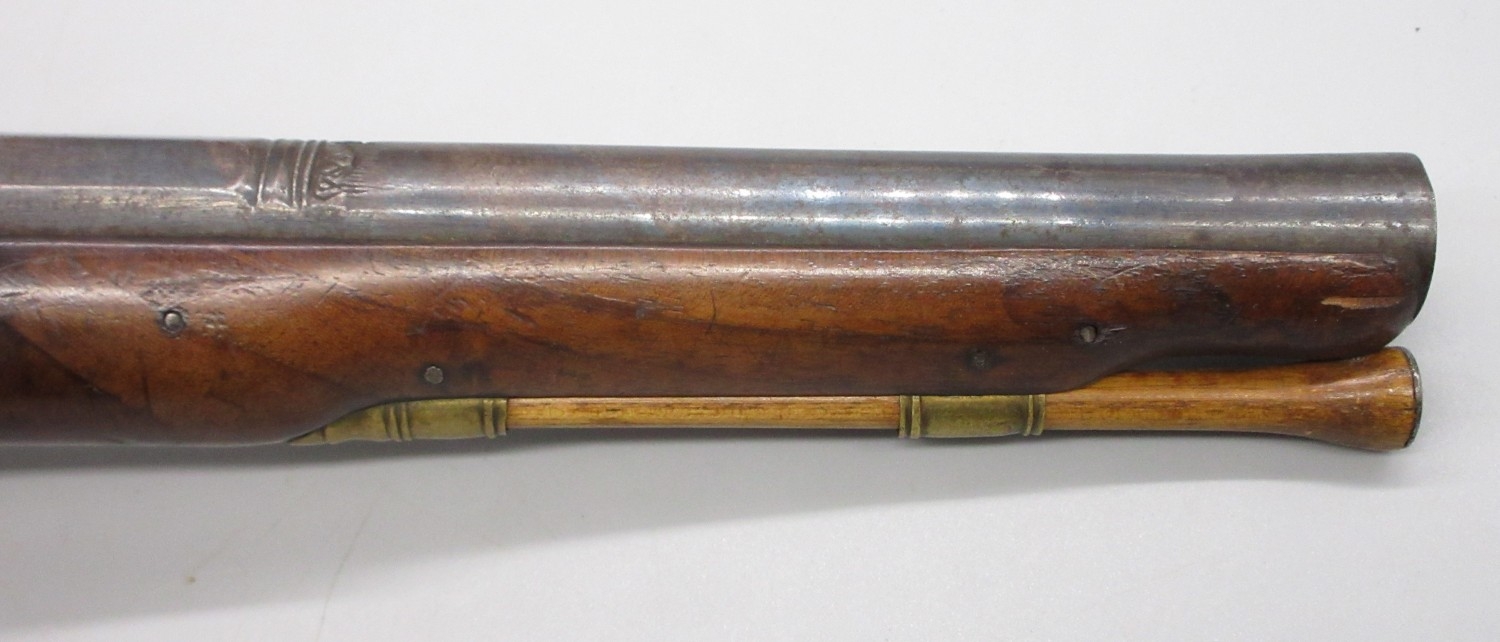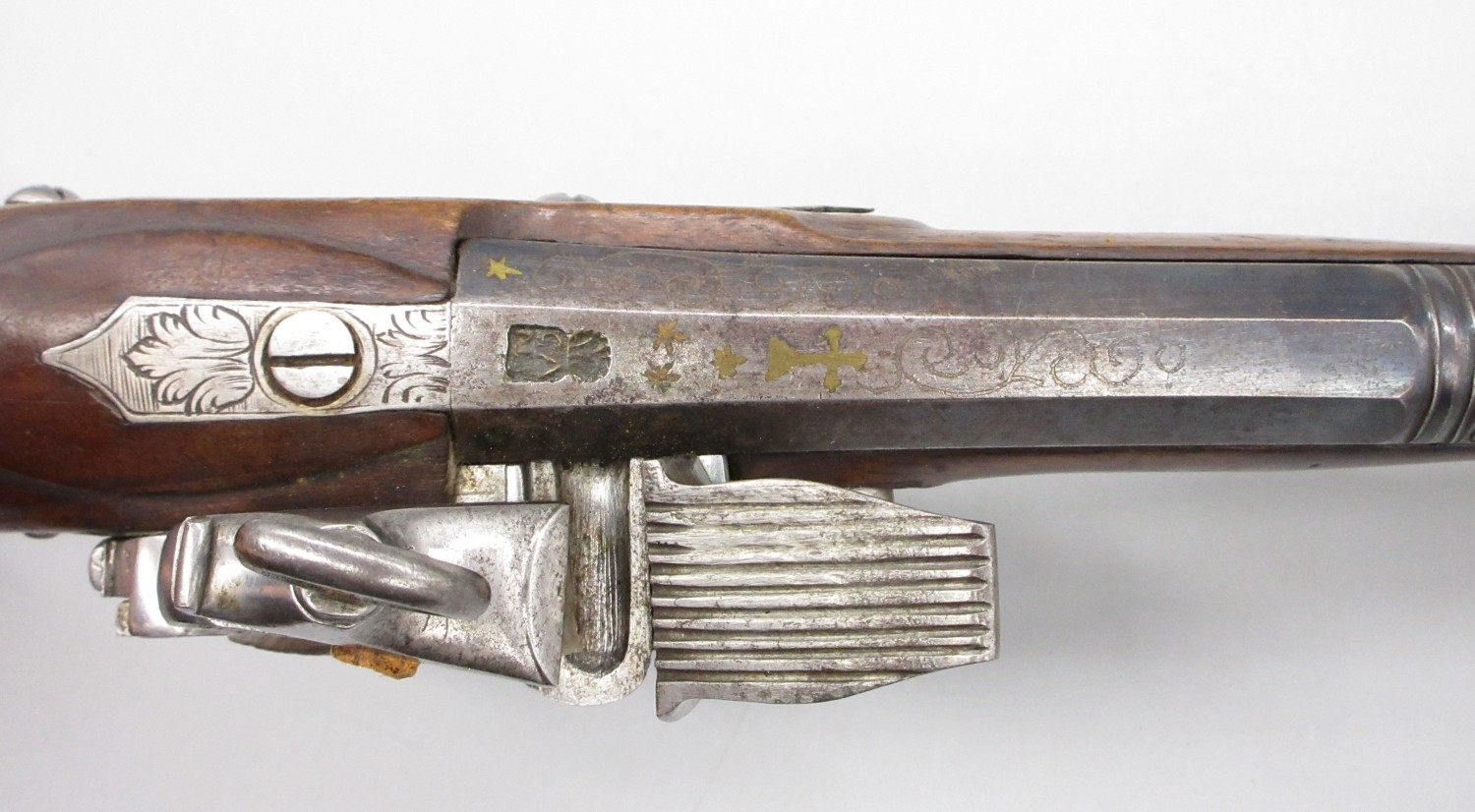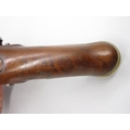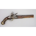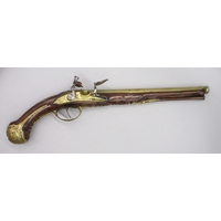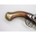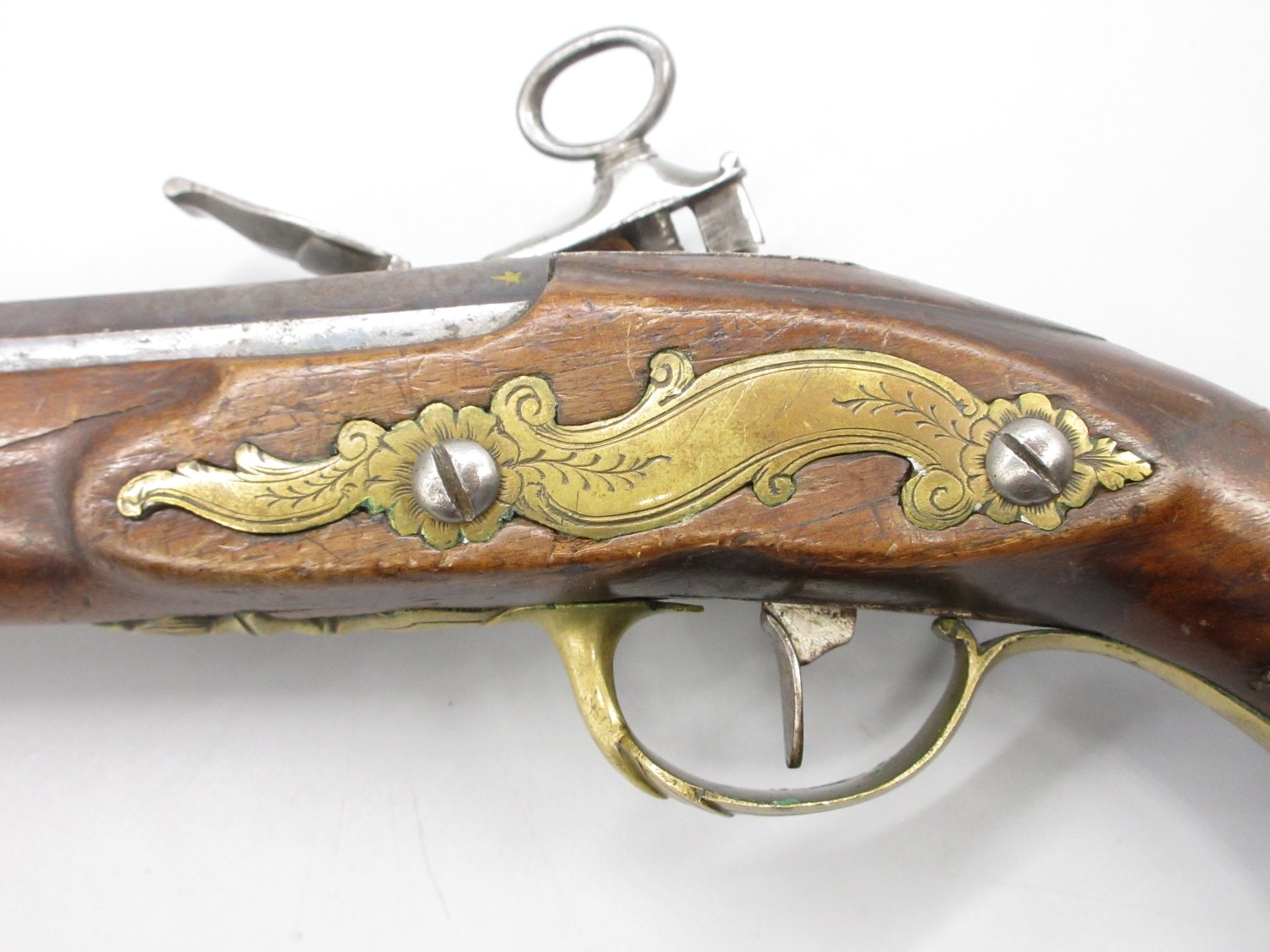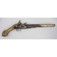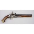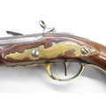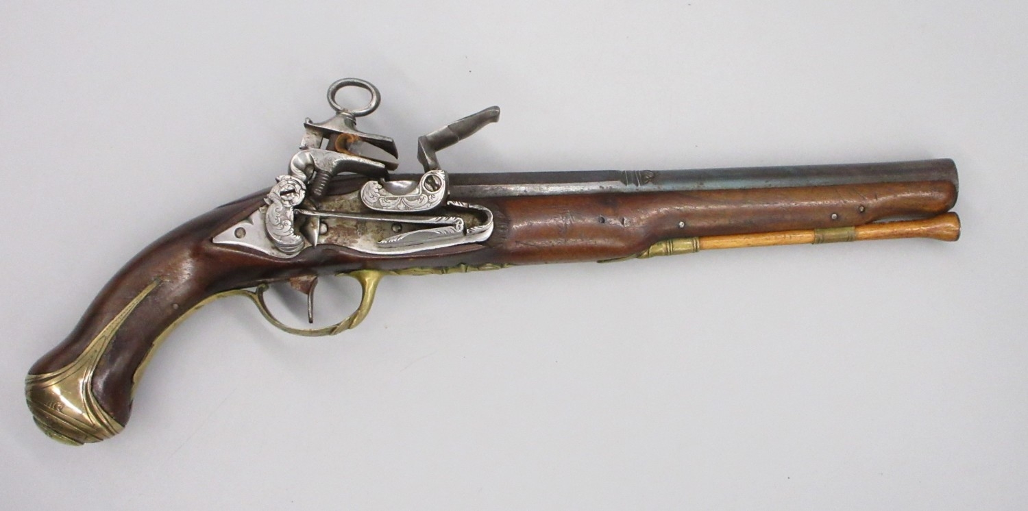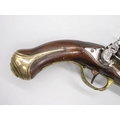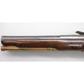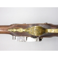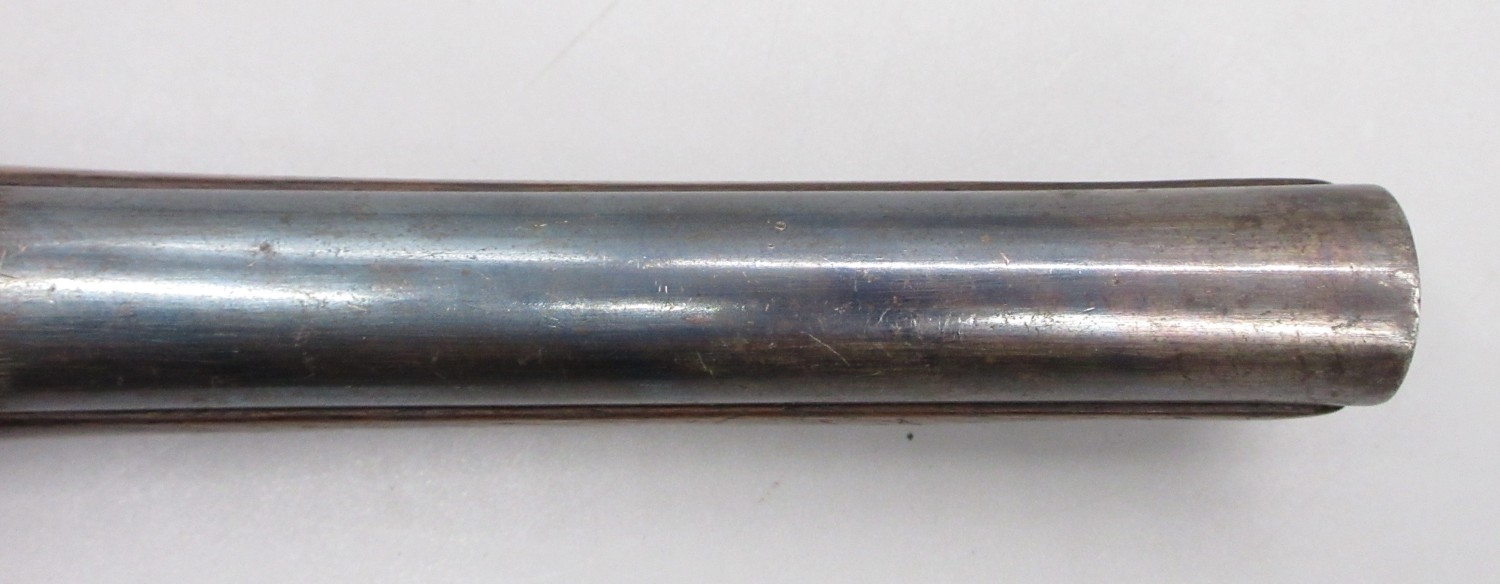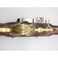 Pair of Spanish 16 bore Miquelet pistols, 9.5" staged half octagonal barrels with various stamped markings and inlaid detail, brass mounts, complete with ramrods, 38cm overall