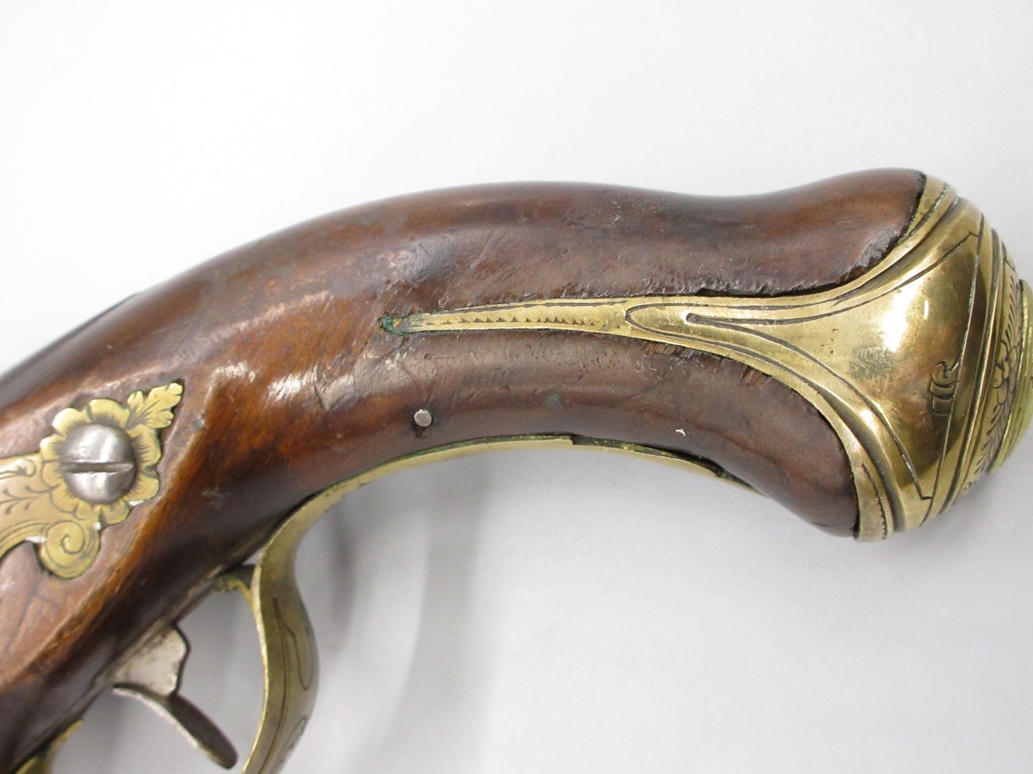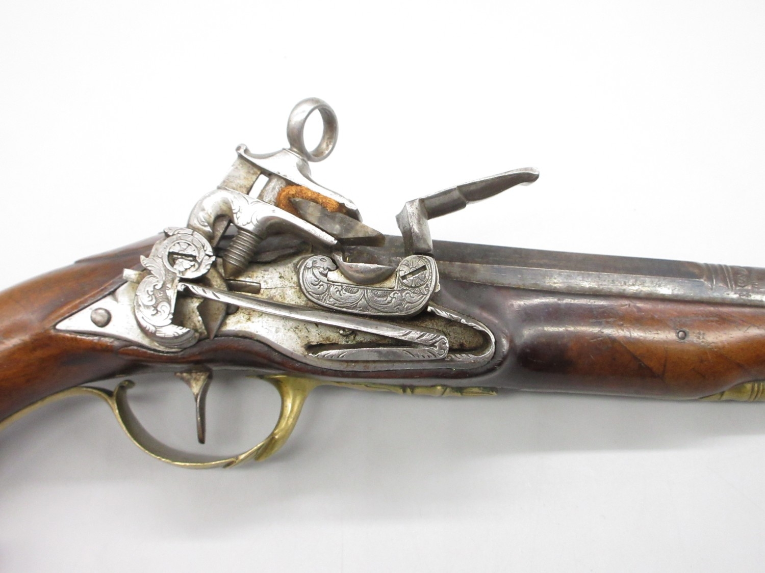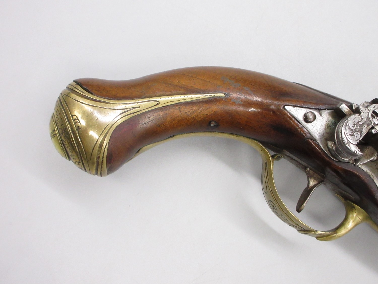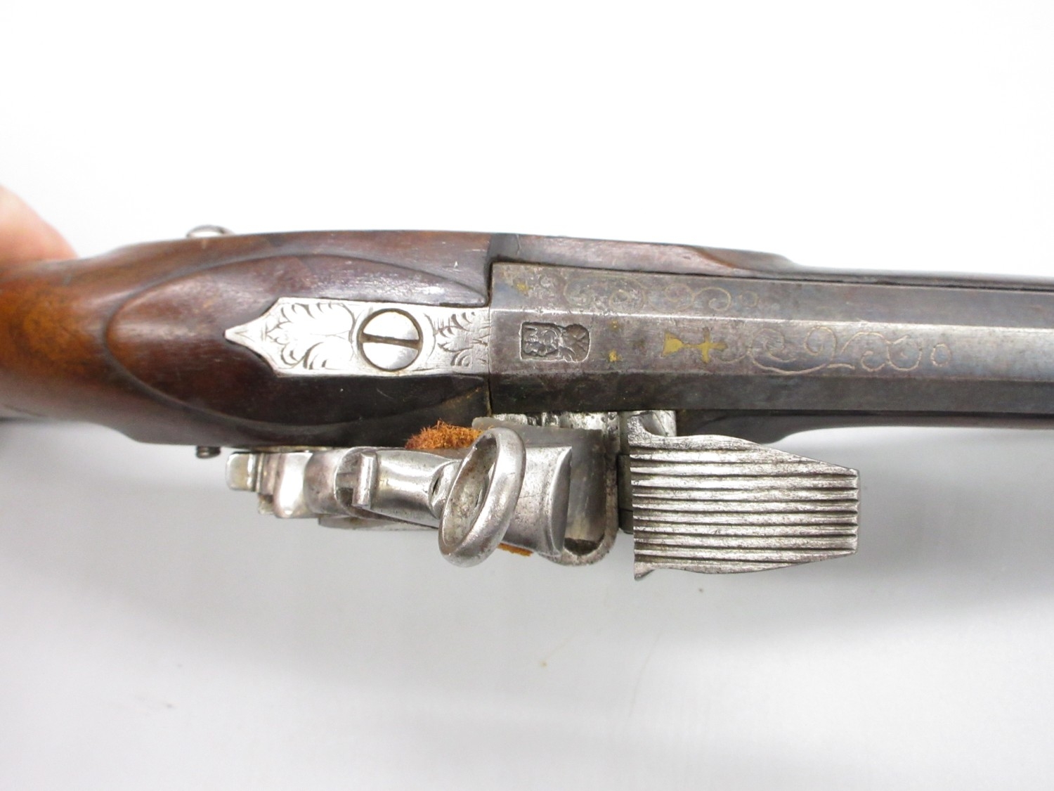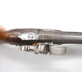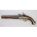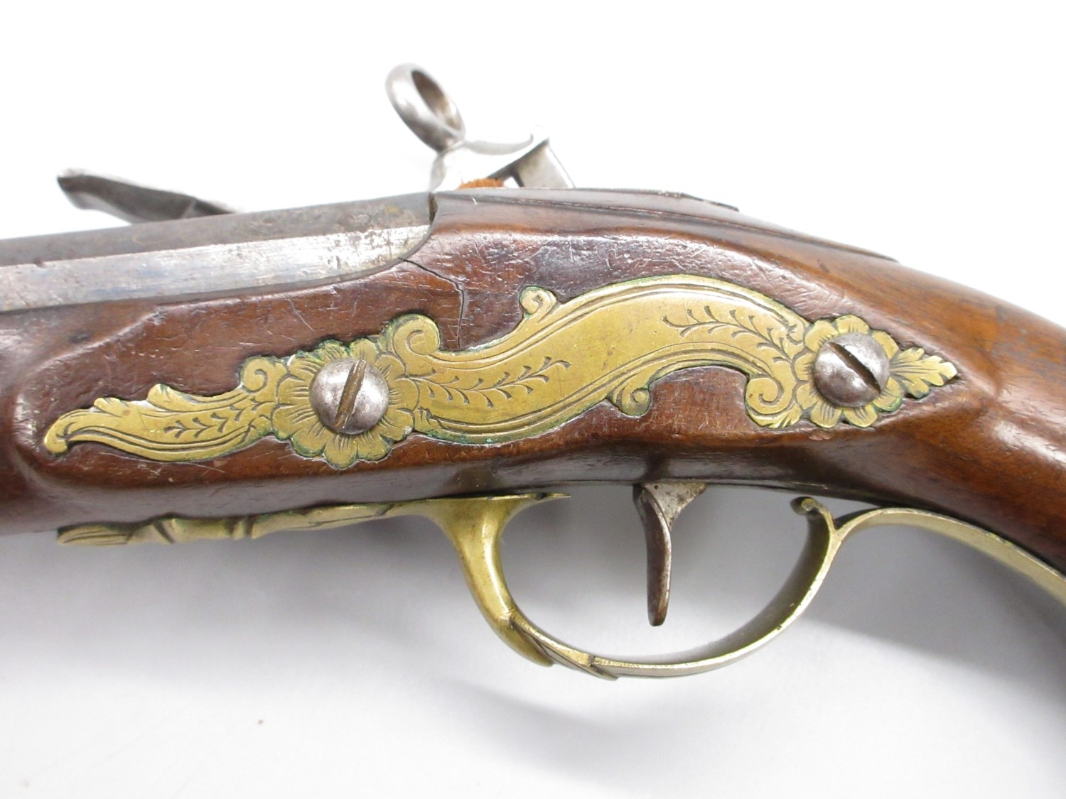 Pair of Spanish 16 bore Miquelet pistols, 9.5" staged half octagonal barrels with various stamped markings and inlaid detail, brass mounts, complete with ramrods, 38cm overall