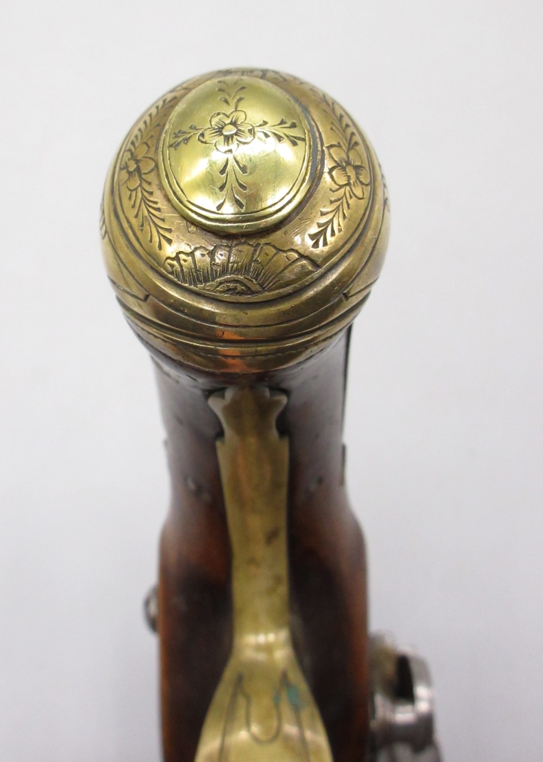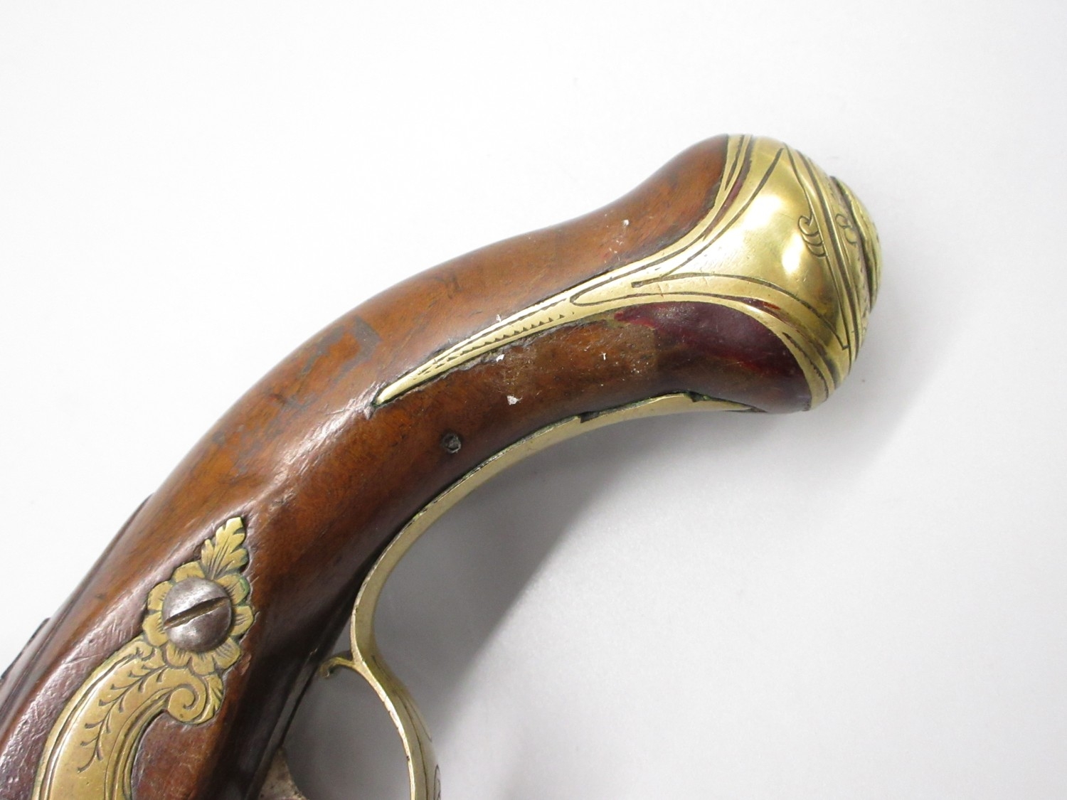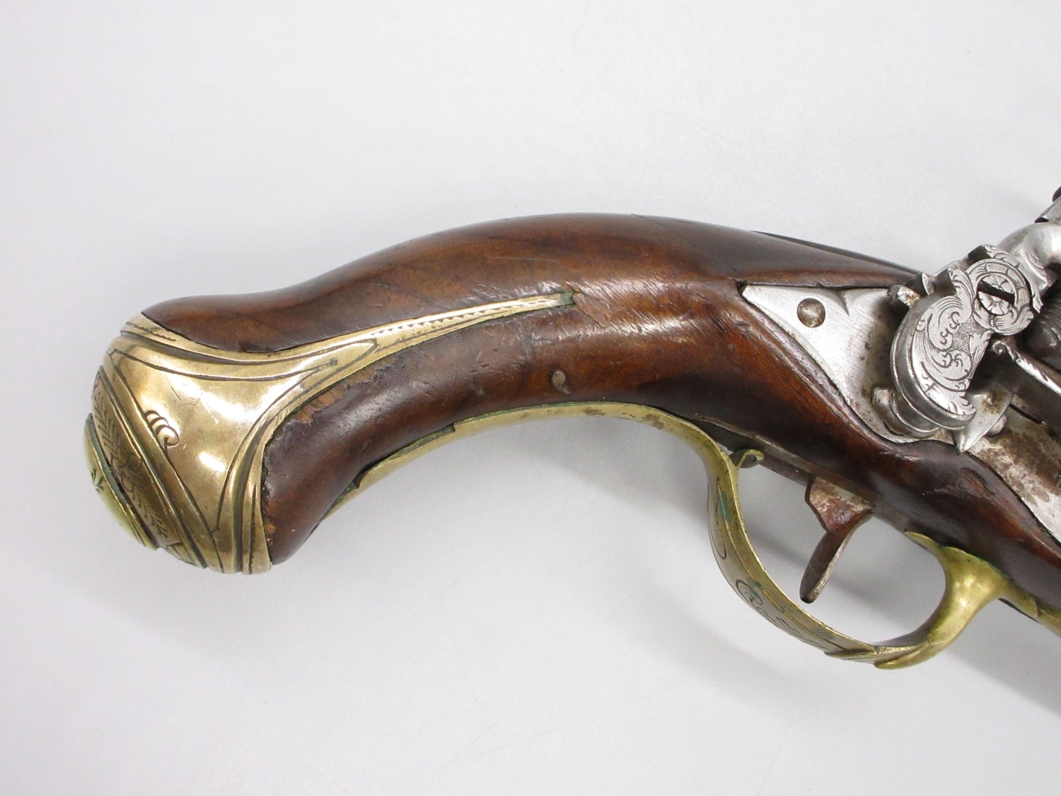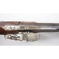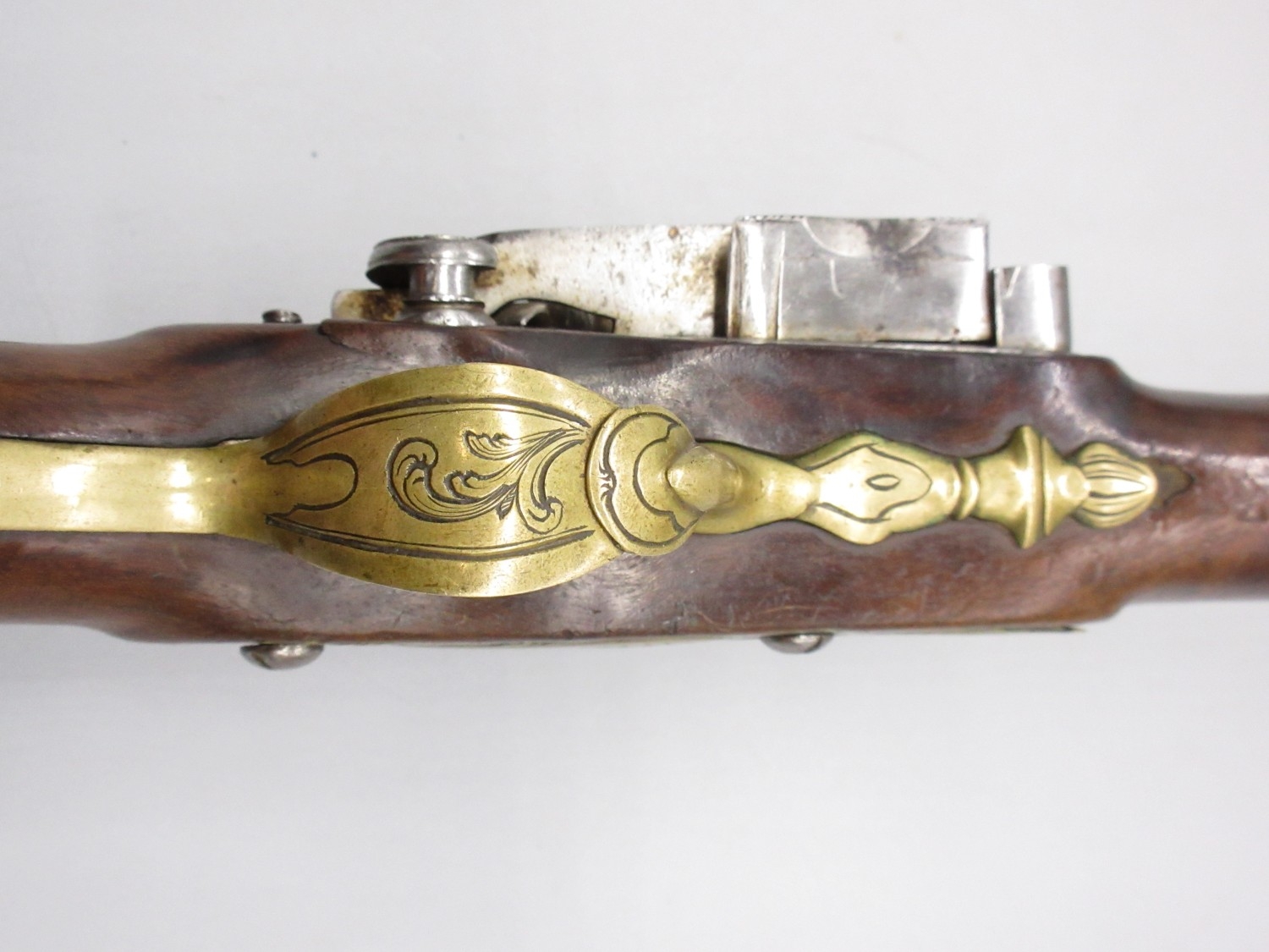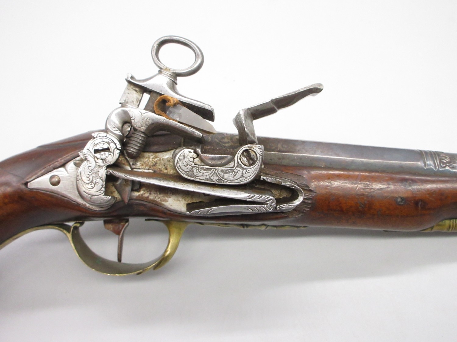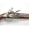 Pair of Spanish 16 bore Miquelet pistols, 9.5" staged half octagonal barrels with various stamped markings and inlaid detail, brass mounts, complete with ramrods, 38cm overall