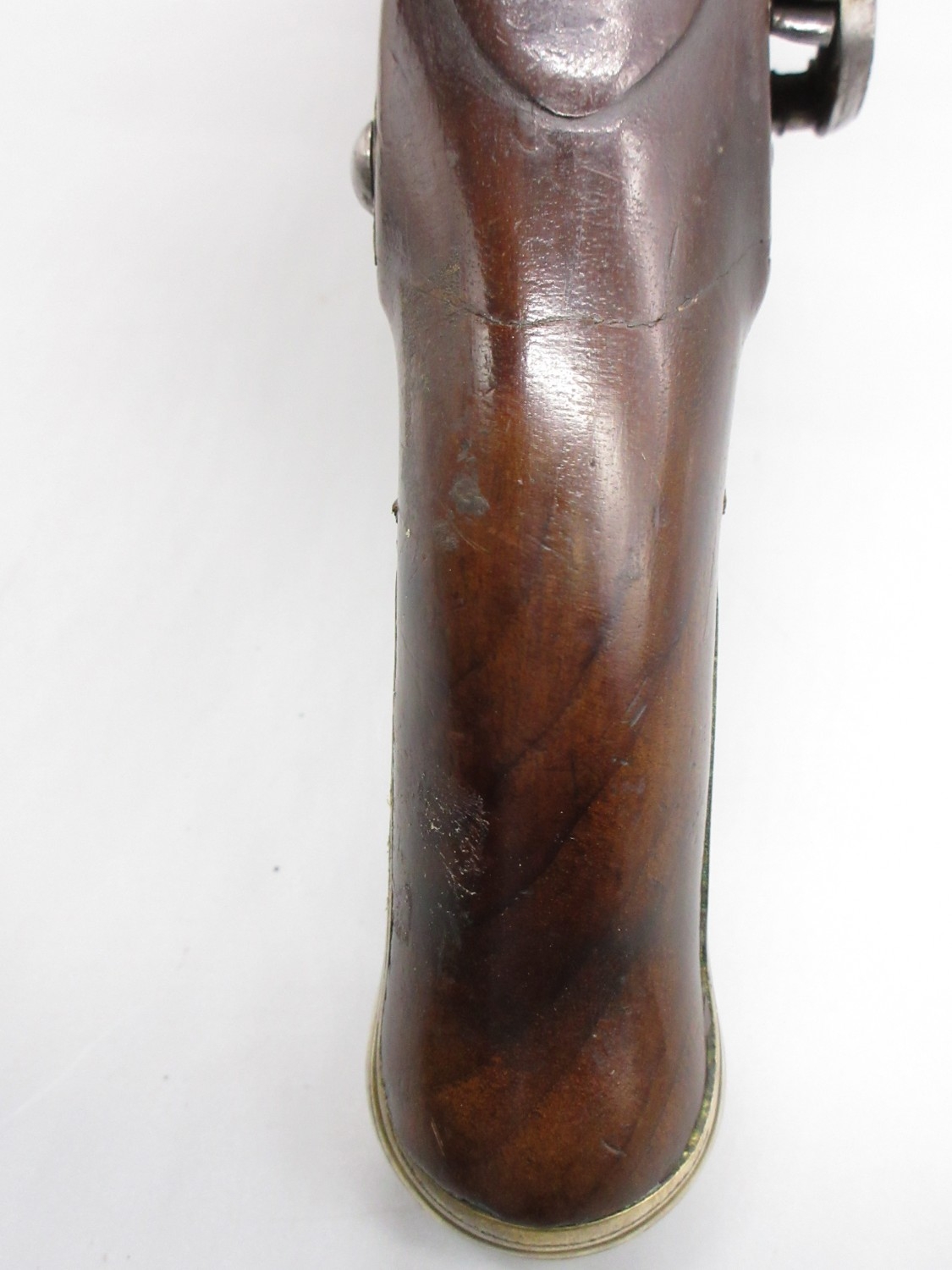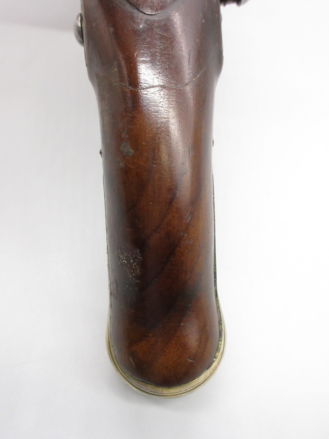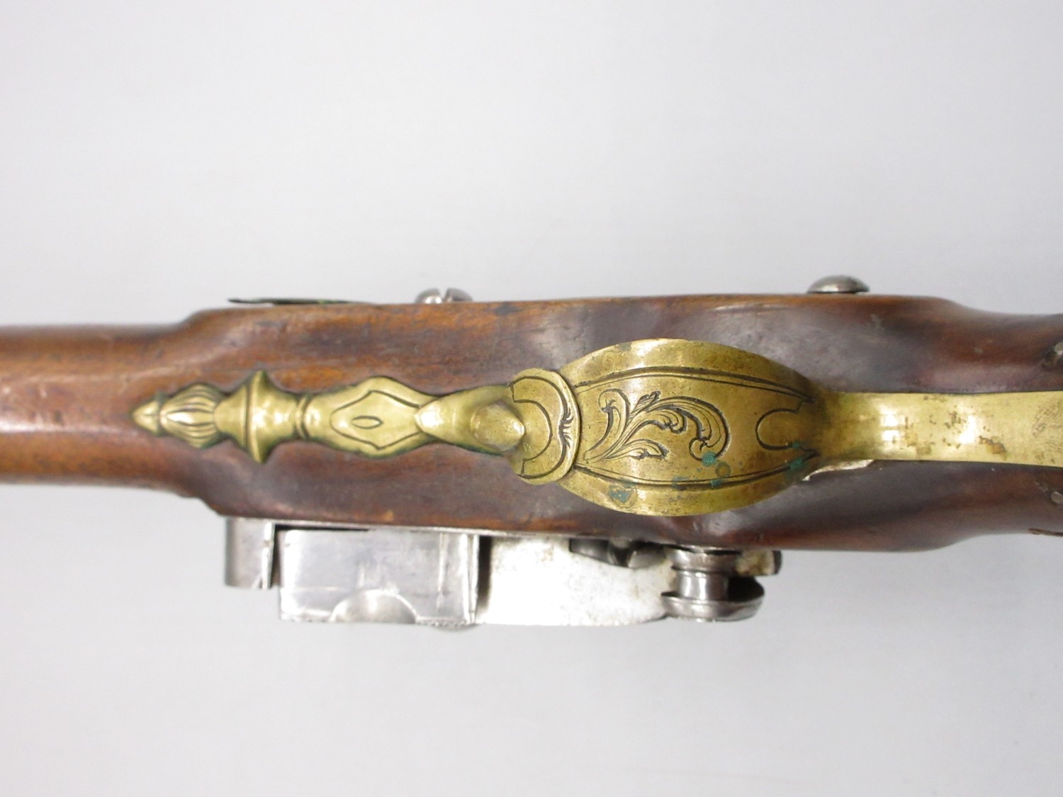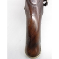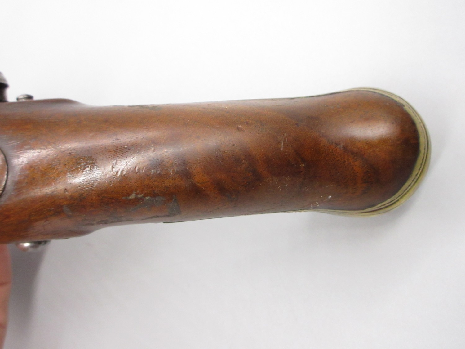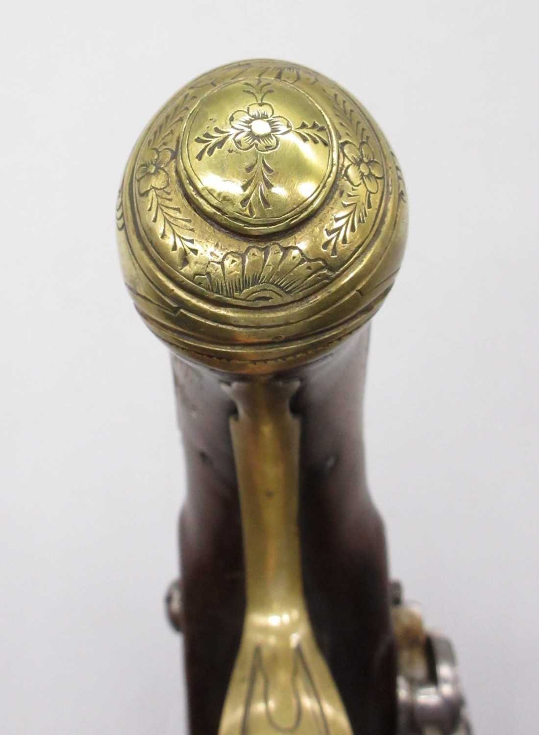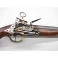 Pair of Spanish 16 bore Miquelet pistols, 9.5" staged half octagonal barrels with various stamped markings and inlaid detail, brass mounts, complete with ramrods, 38cm overall