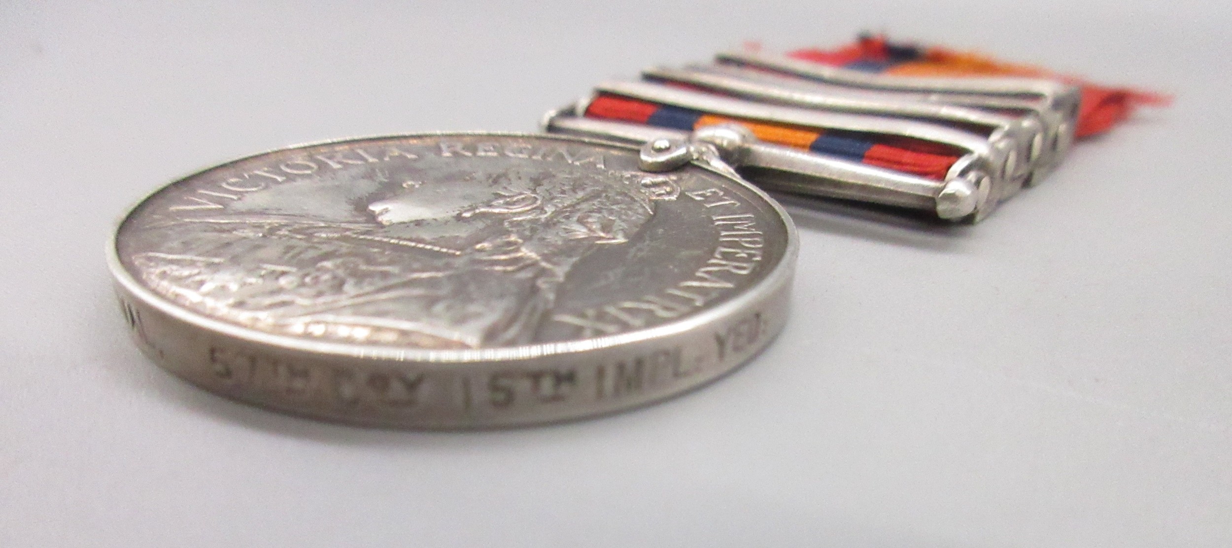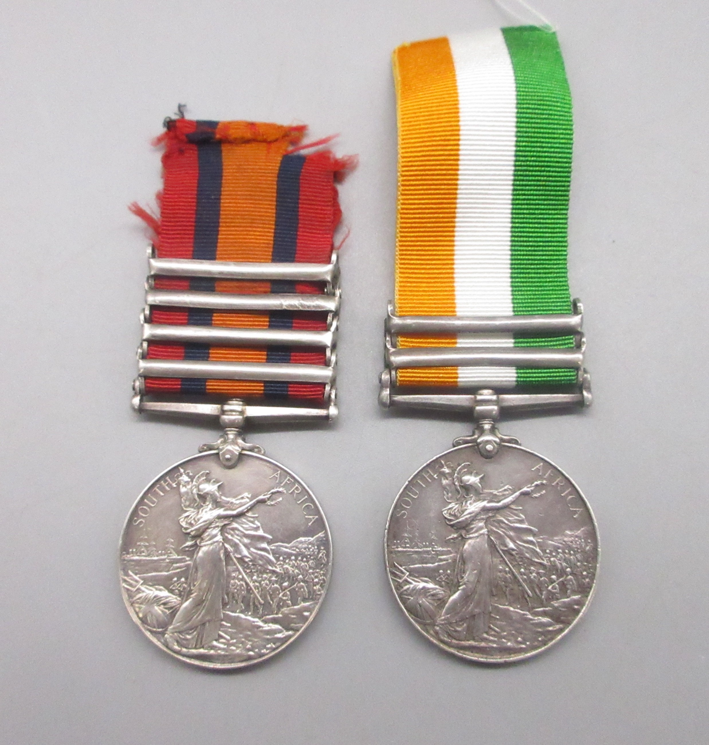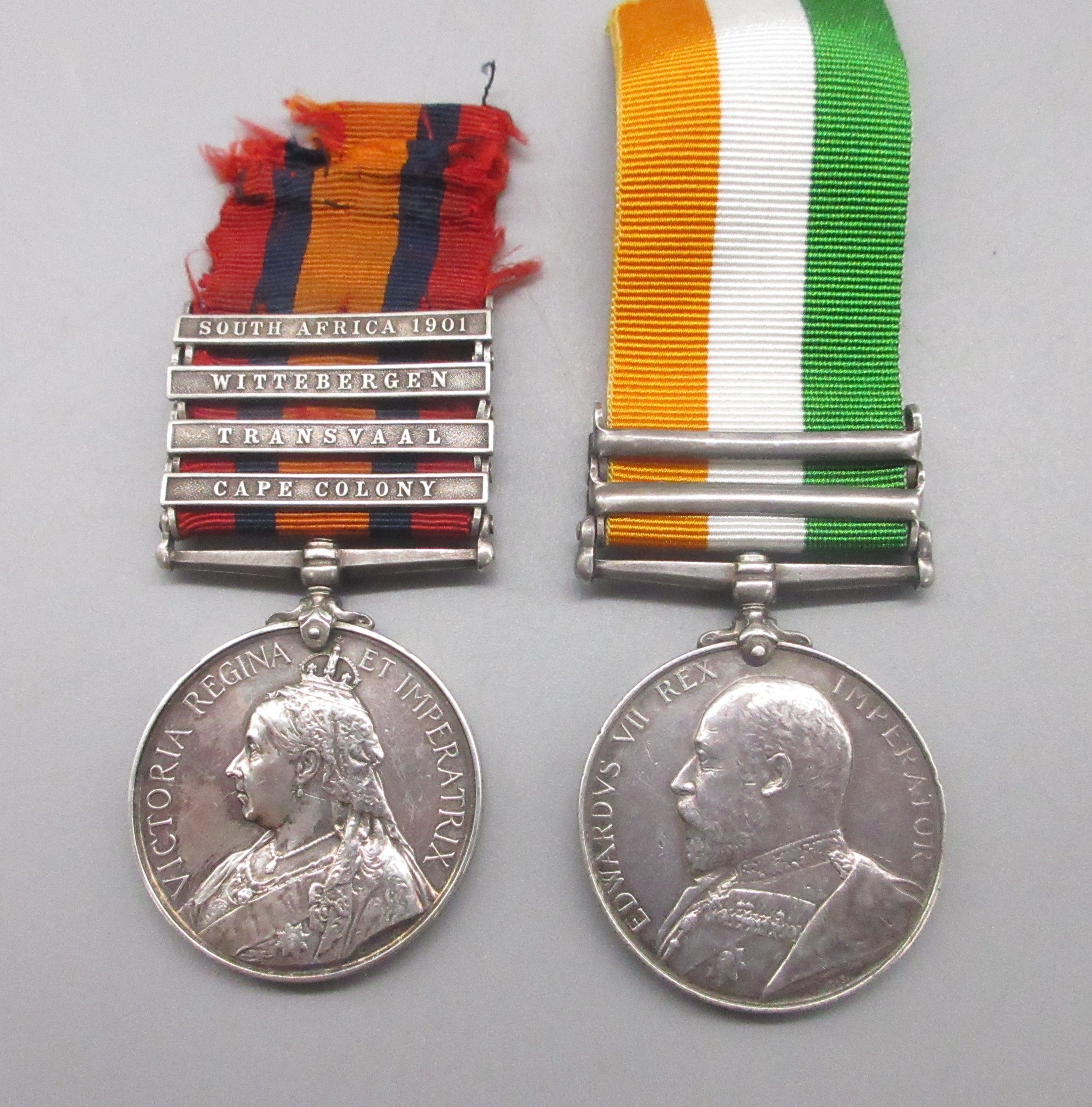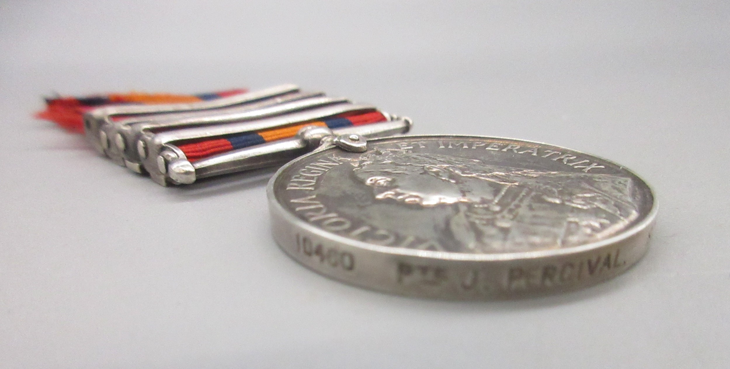 Queens South Africa Medal with four clasps, South Africa 1901, Wittebergen, Transvaal, Cape Colony. To 10460 Pte J. Percival 57th Coy 15th Imperial Yeomanry and King's South Africa Medal with South Africa 1901 and 1902 clasps (with accompanying vendor research for Percival)