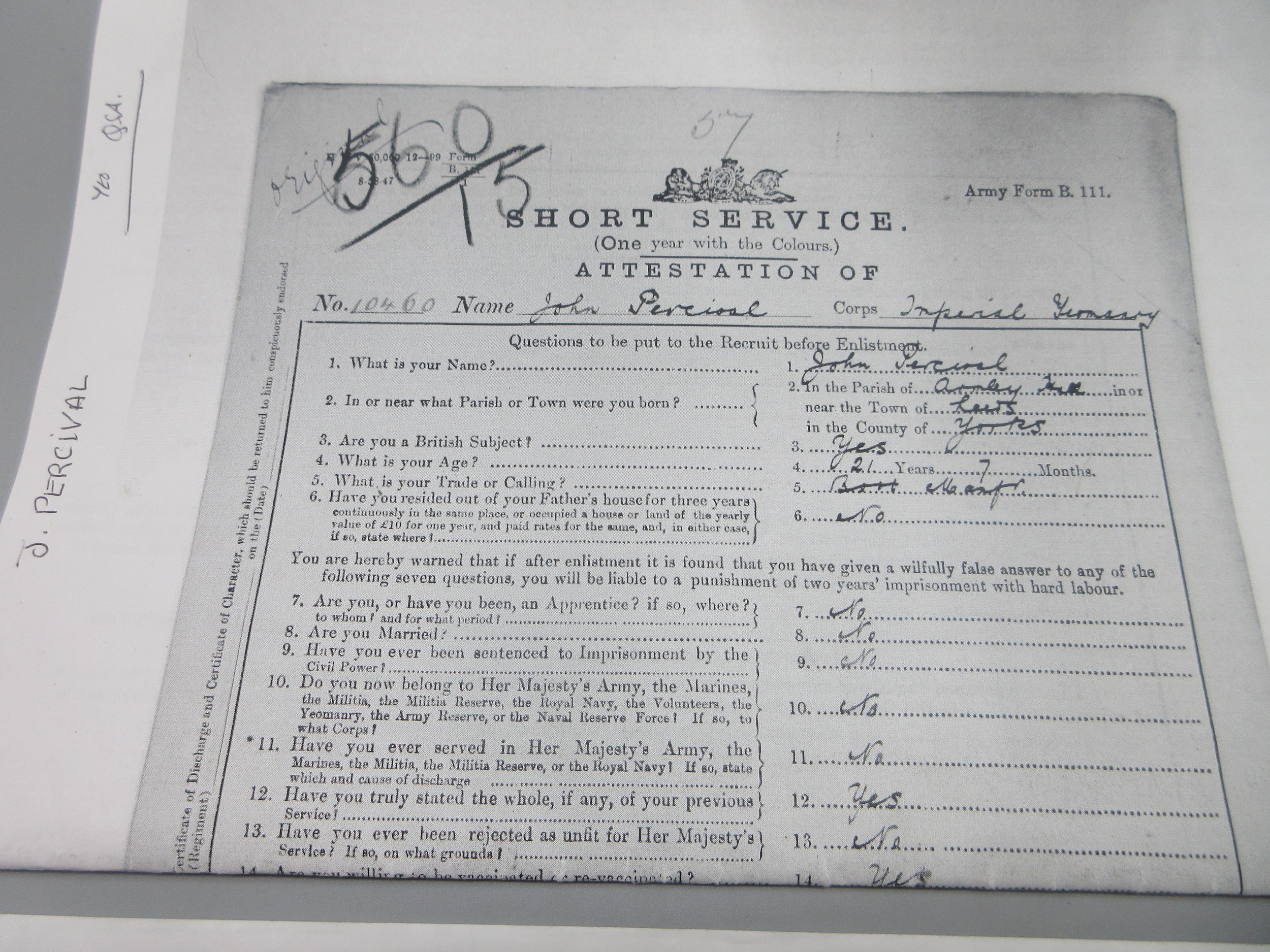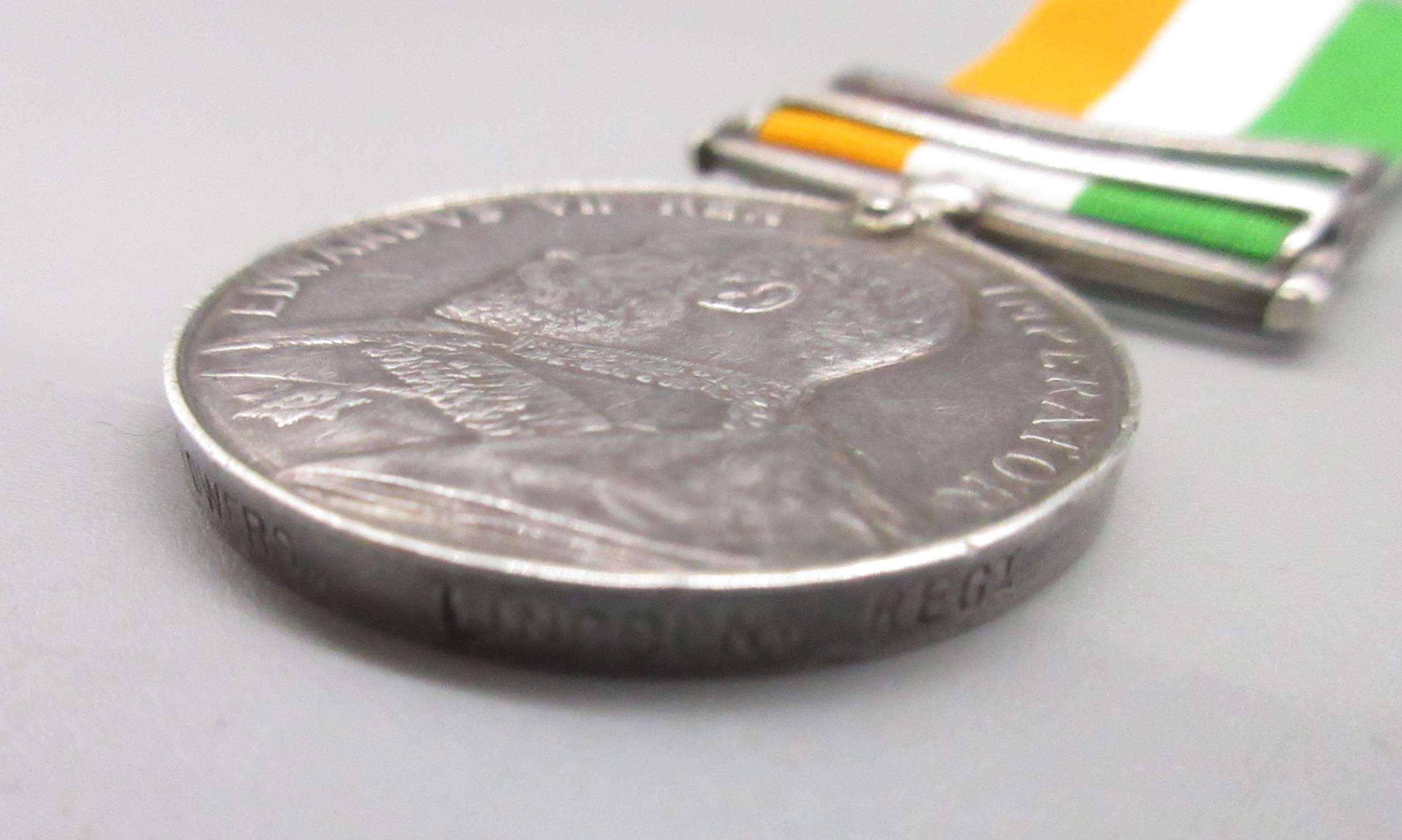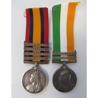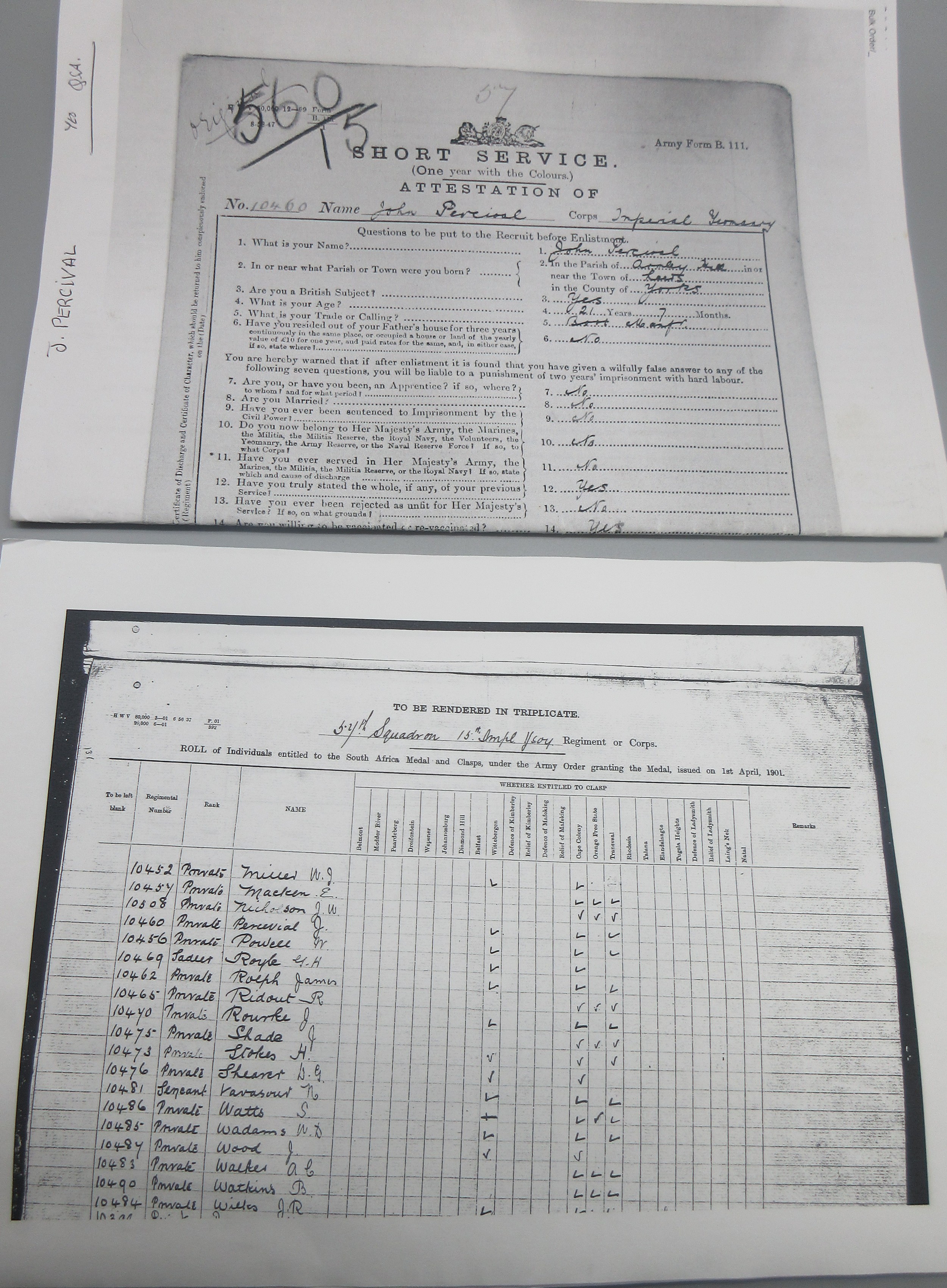 Queens South Africa Medal with four clasps, South Africa 1901, Wittebergen, Transvaal, Cape Colony. To 10460 Pte J. Percival 57th Coy 15th Imperial Yeomanry and King's South Africa Medal with South Africa 1901 and 1902 clasps (with accompanying vendor research for Percival)