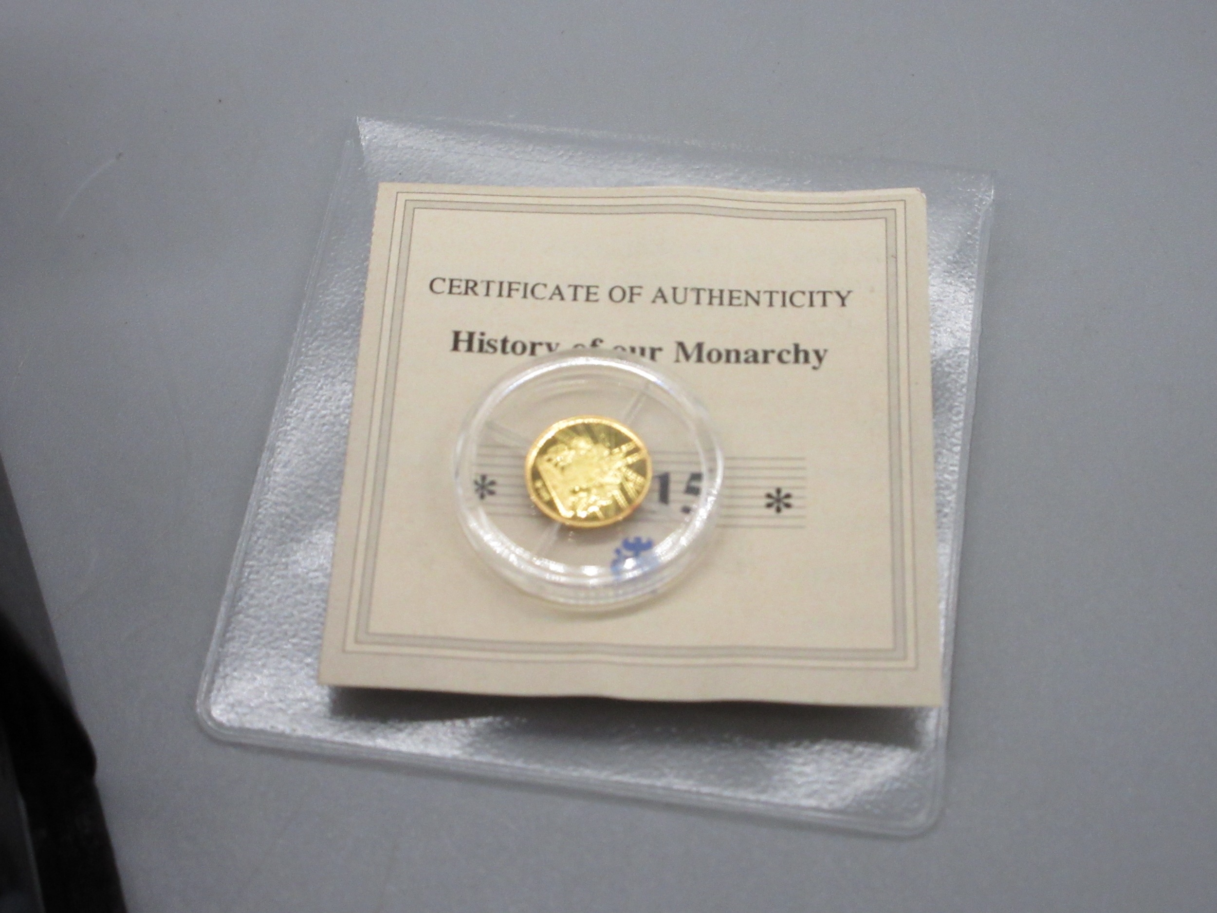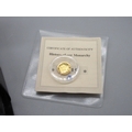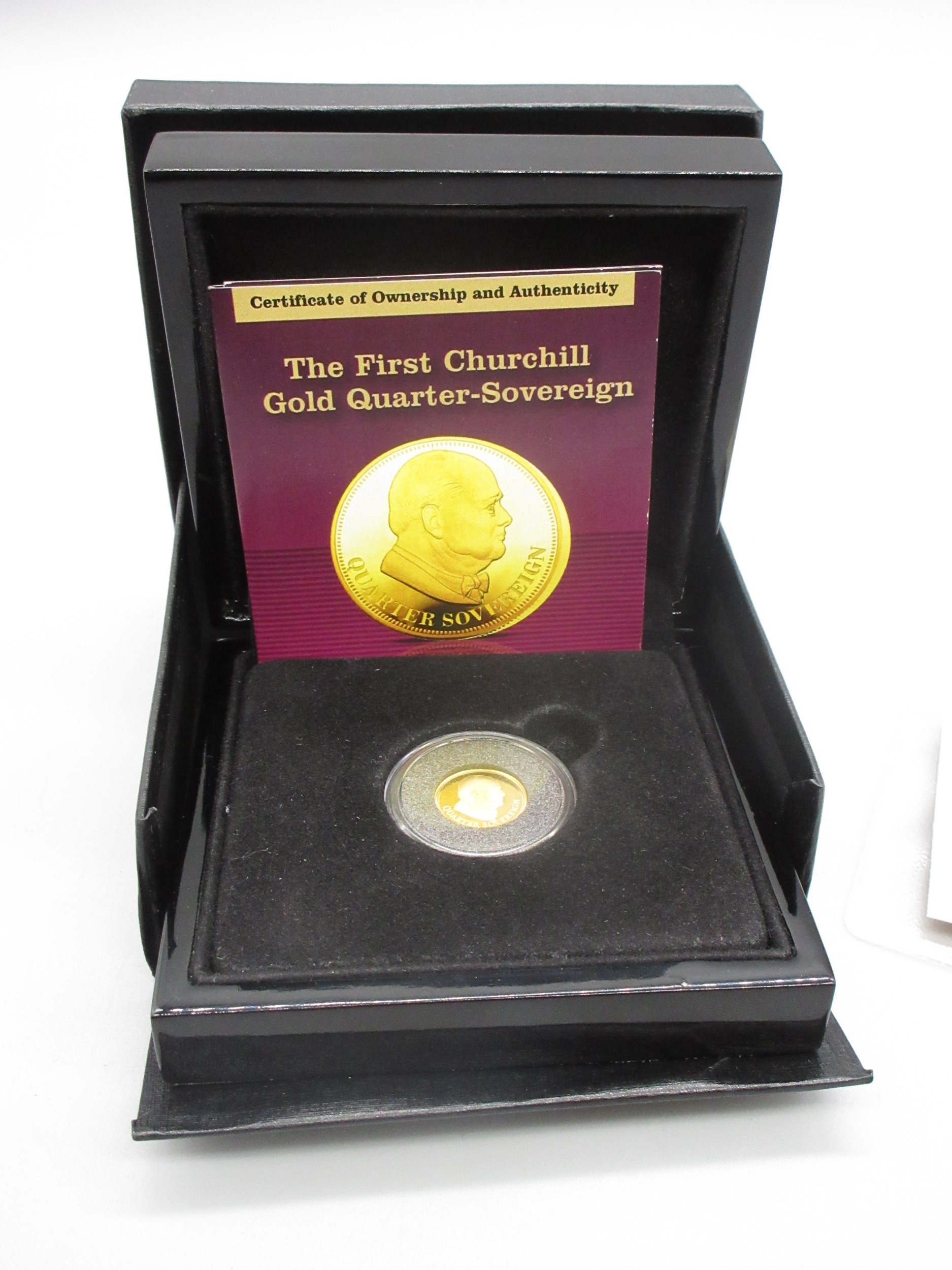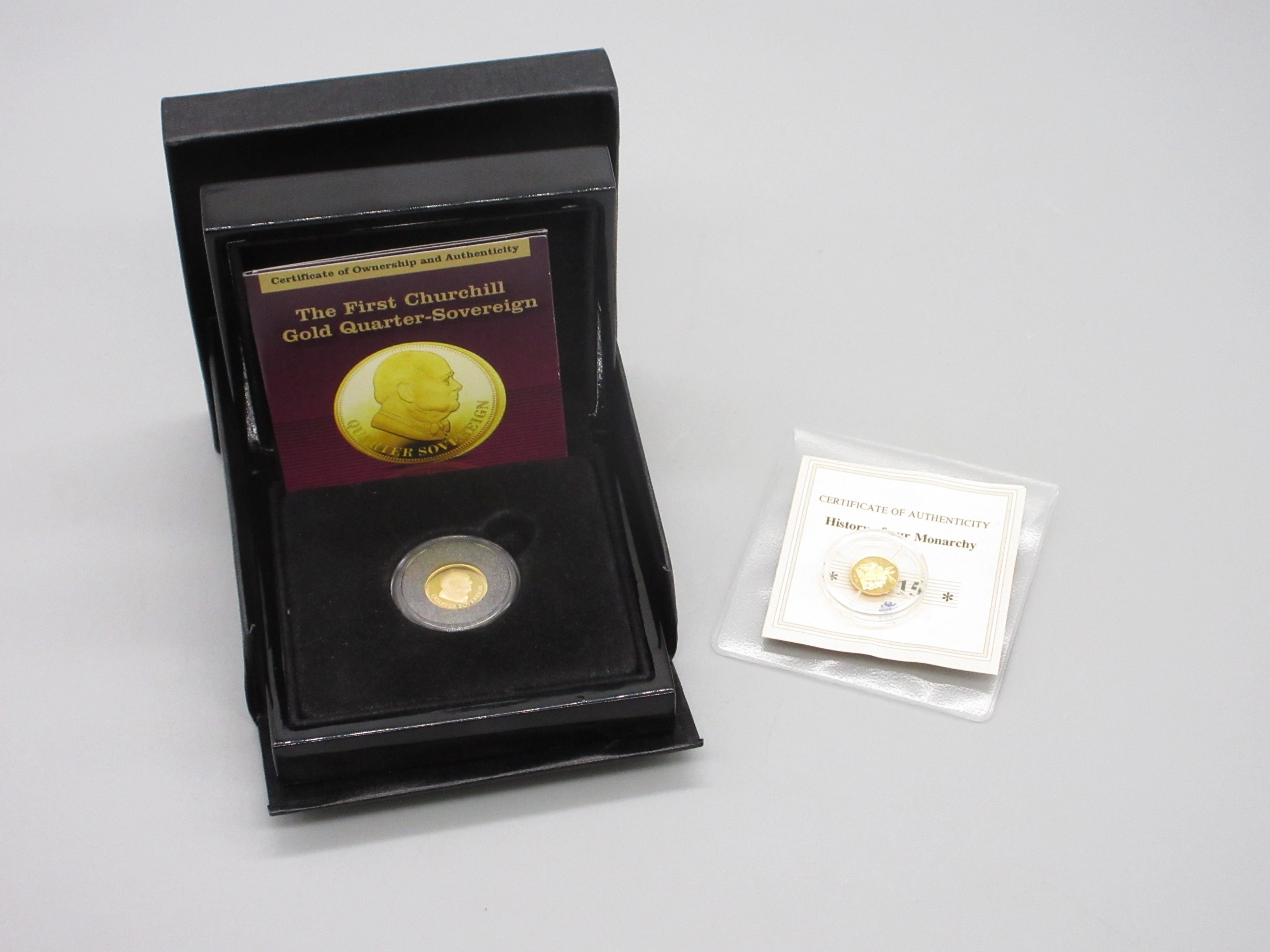 The London Mint Office - The First Churchill Gold Quarter-Sovereign encapsulated in case with COA and a .585 marked 0.5g coin