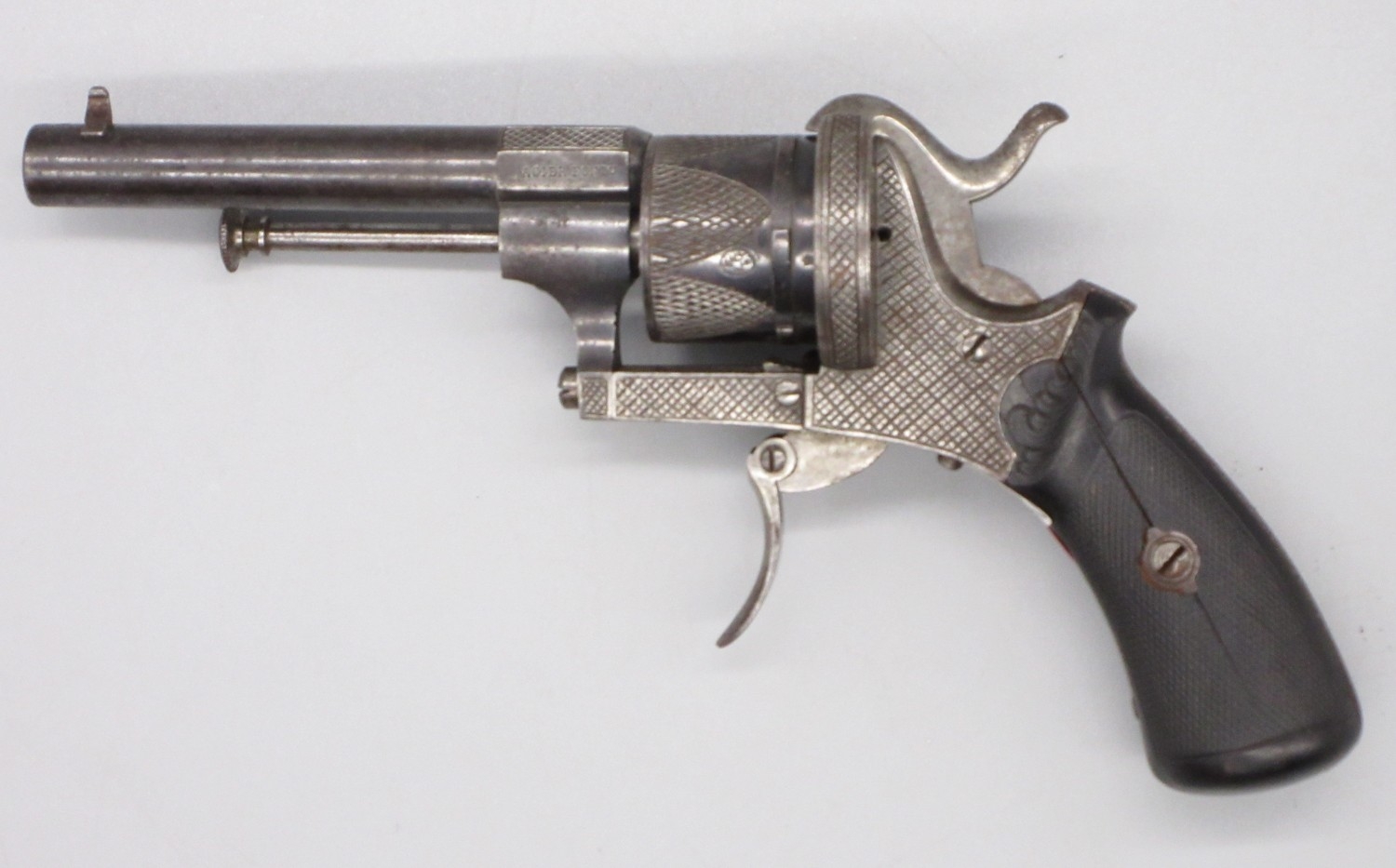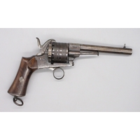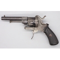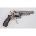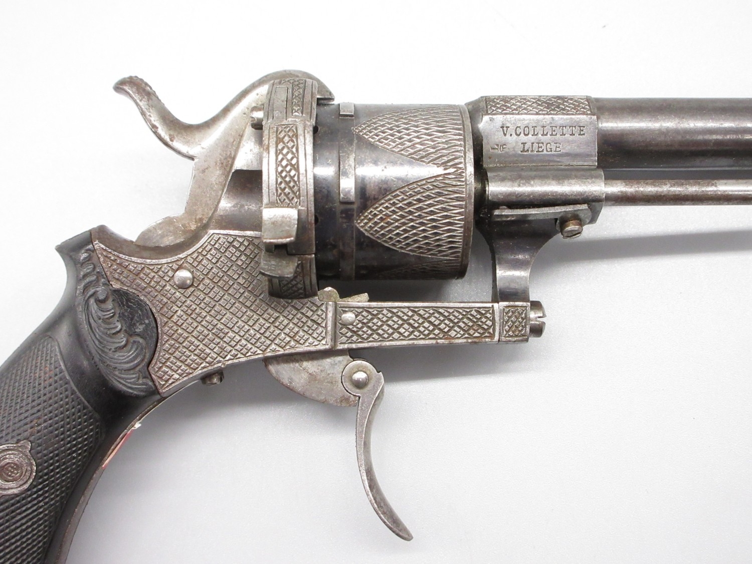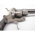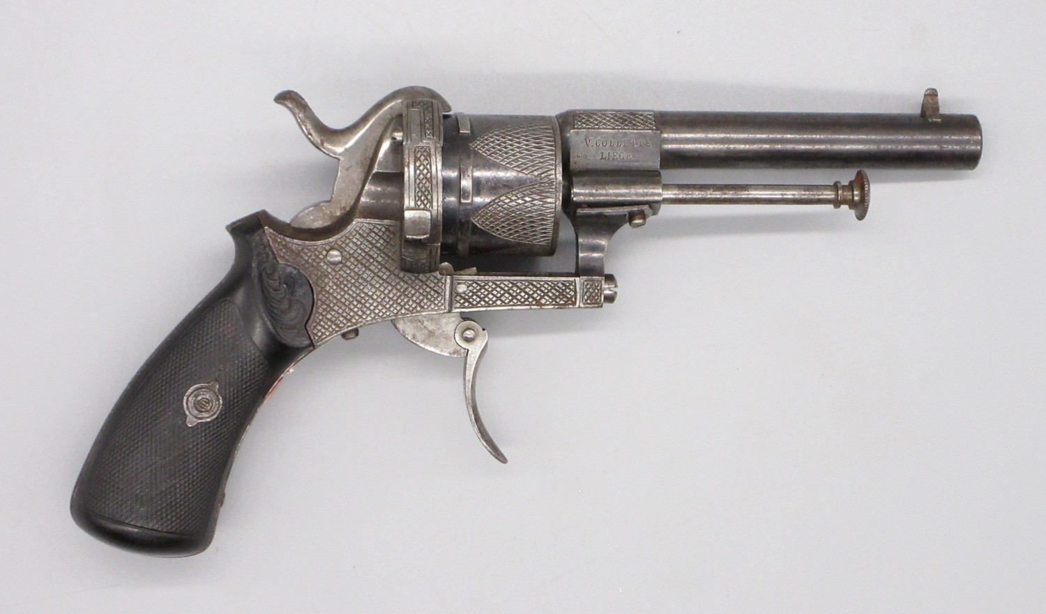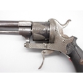 Small Belgian 7mm six shot pinfire revolver, 3.5" barrel stamped 'V.Collette Liege, Acier Fondu' folding trigger, engraved detail and Leige proof mark, 19cm overall