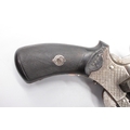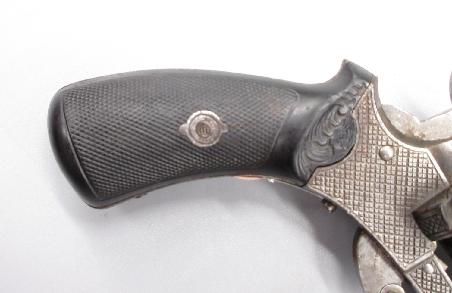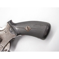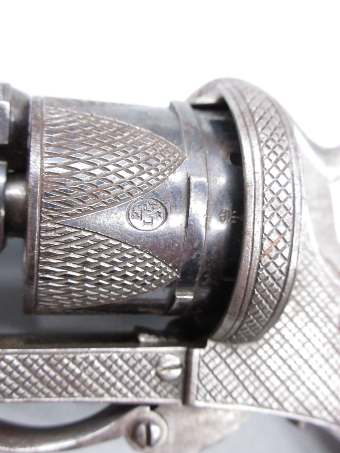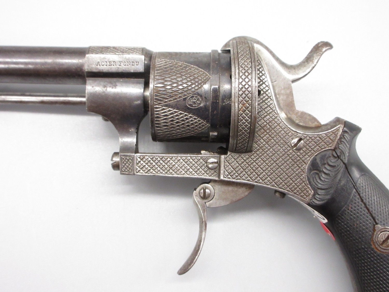 Small Belgian 7mm six shot pinfire revolver, 3.5" barrel stamped 'V.Collette Liege, Acier Fondu' folding trigger, engraved detail and Leige proof mark, 19cm overall