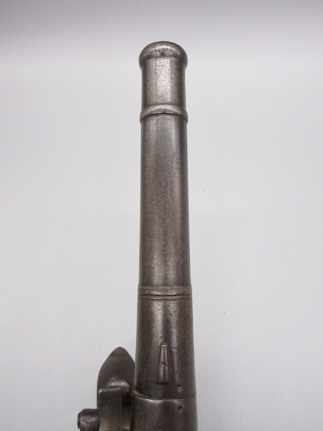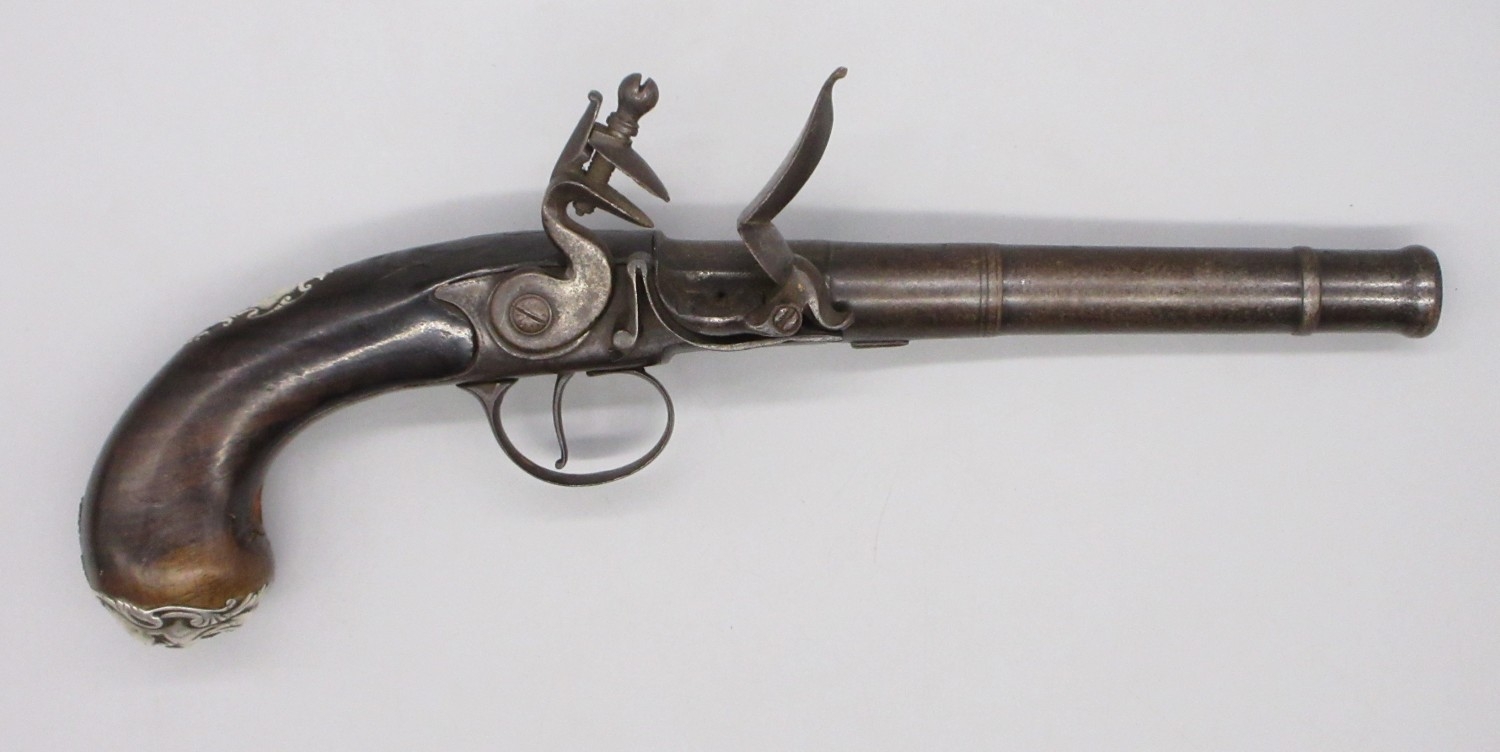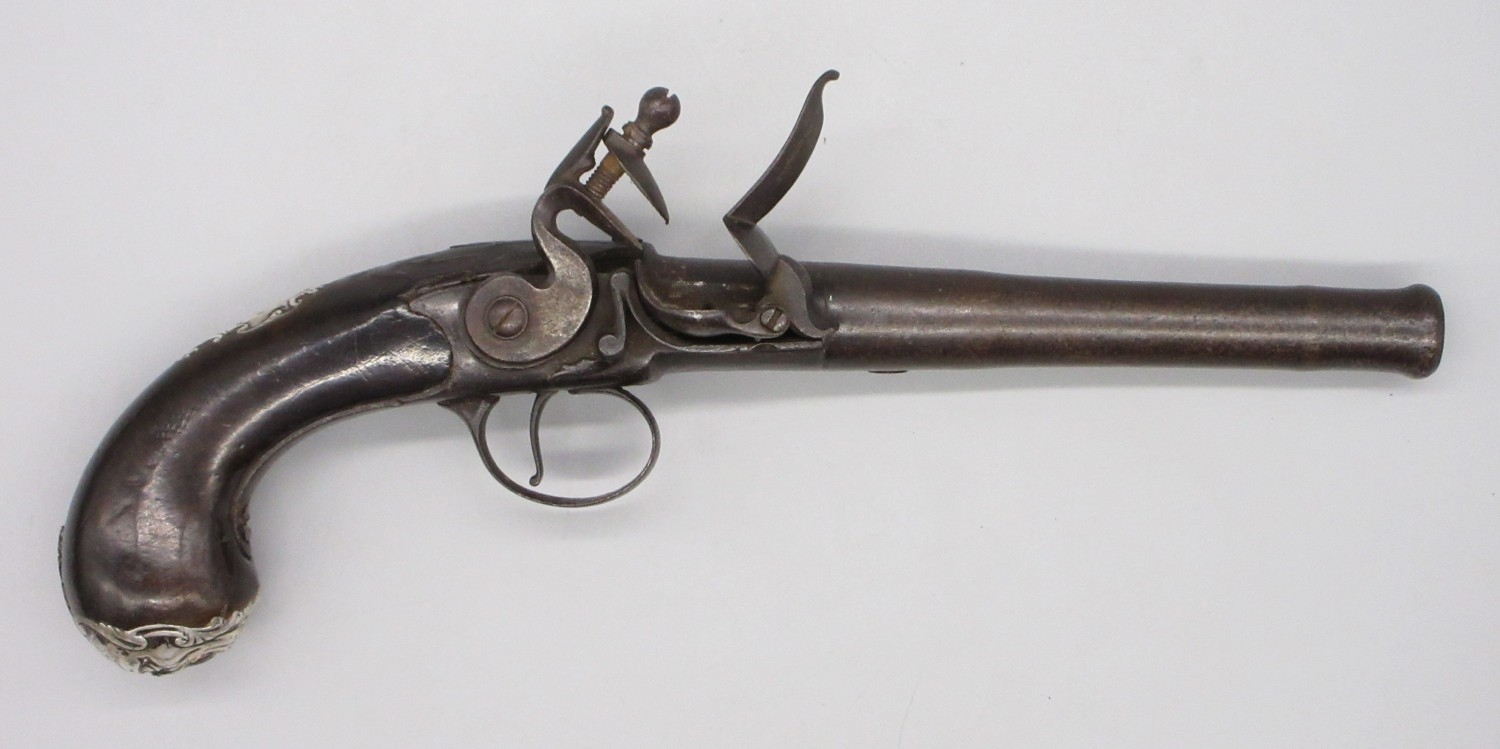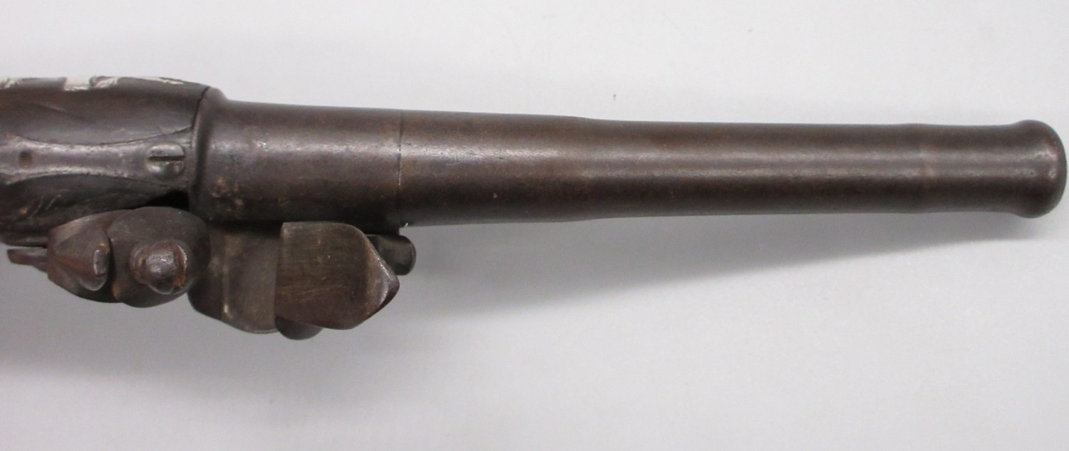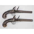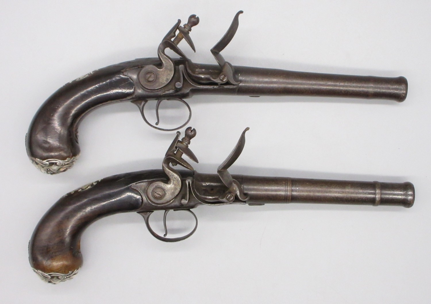 Pair of Queen Anne 20 bore flintlock cannon barrel pistols by `Hawks of Oxford', 6" staged cannon barrels, stamped proof marks, faint makers details, white metal mounts and grotesque face mask butt caps, 30cm overall.