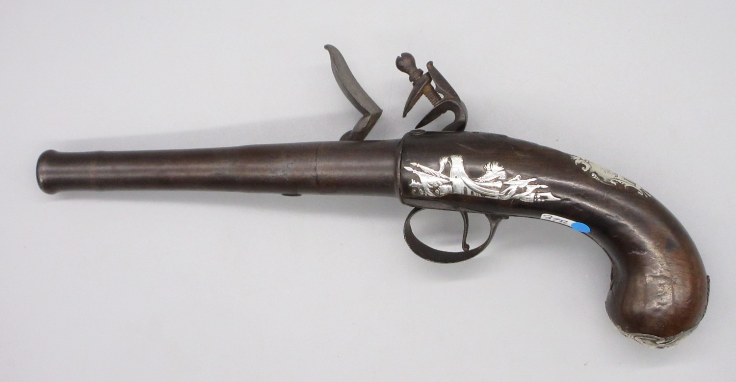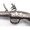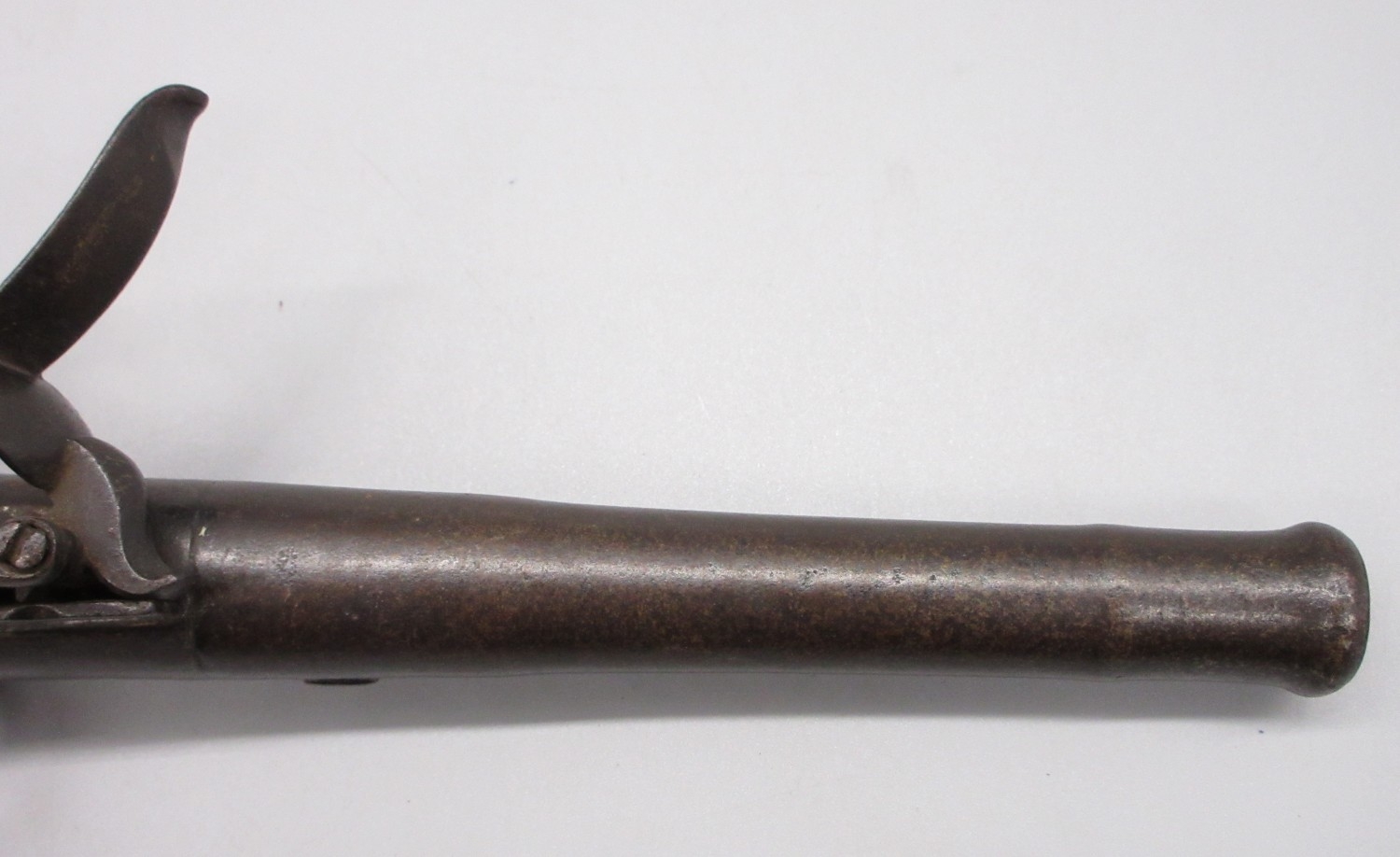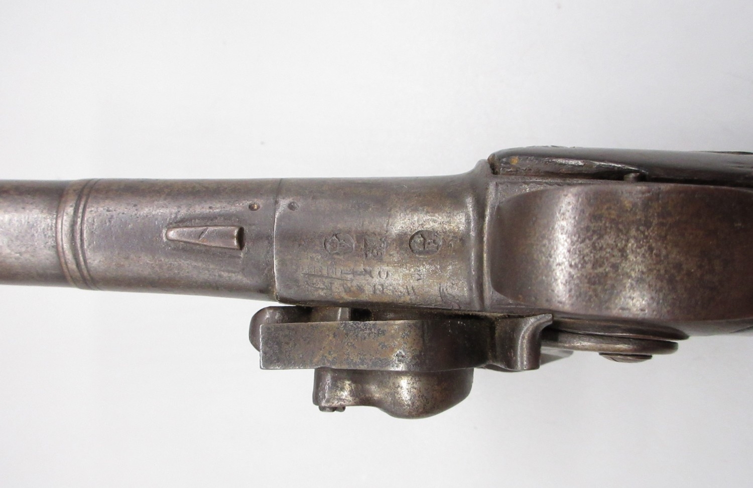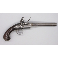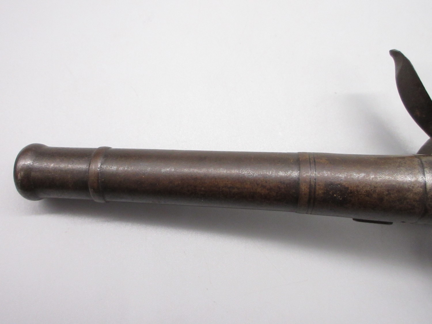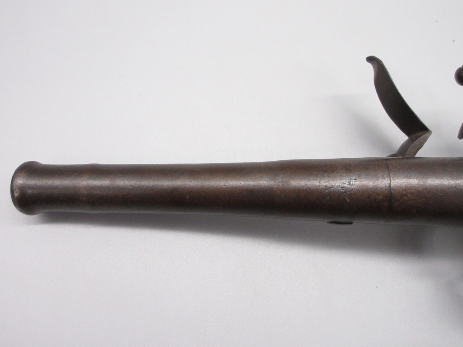 Pair of Queen Anne 20 bore flintlock cannon barrel pistols by `Hawks of Oxford', 6" staged cannon barrels, stamped proof marks, faint makers details, white metal mounts and grotesque face mask butt caps, 30cm overall.
