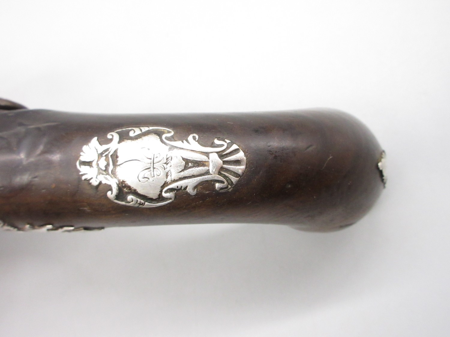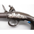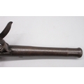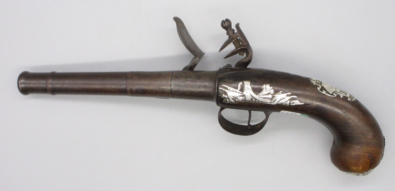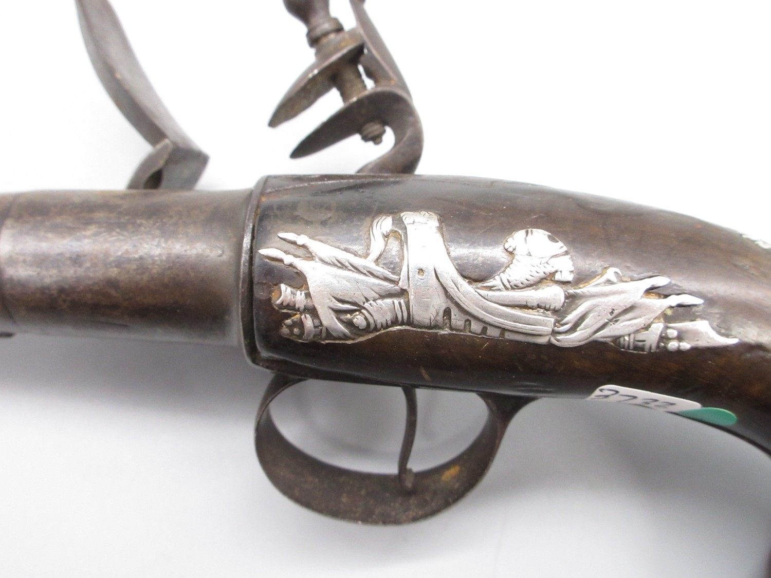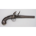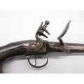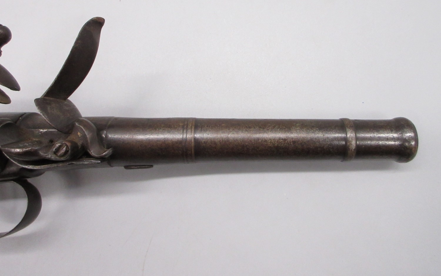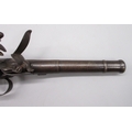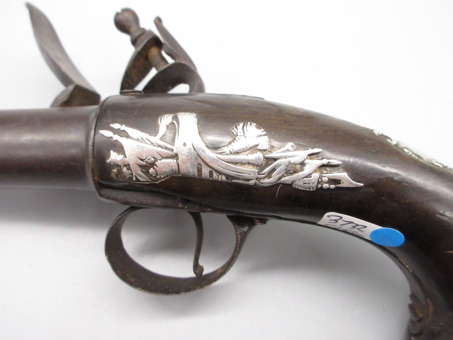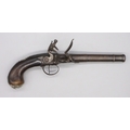 Pair of Queen Anne 20 bore flintlock cannon barrel pistols by `Hawks of Oxford', 6" staged cannon barrels, stamped proof marks, faint makers details, white metal mounts and grotesque face mask butt caps, 30cm overall.