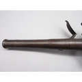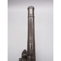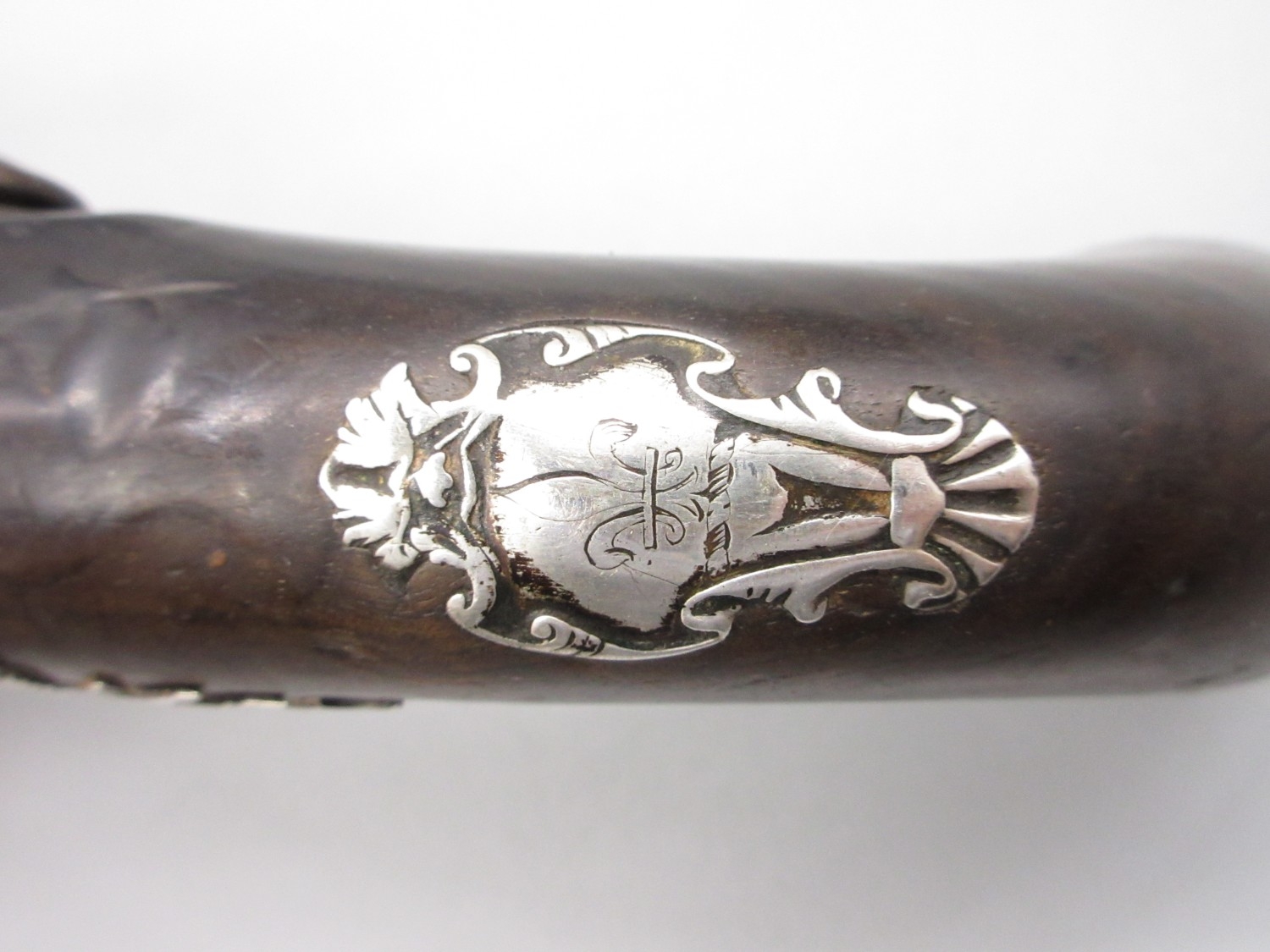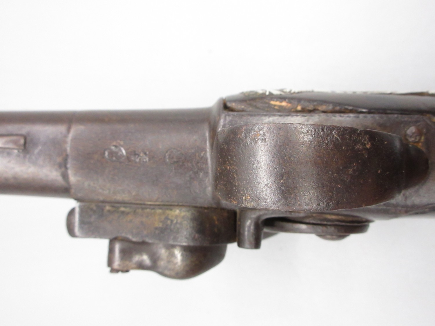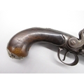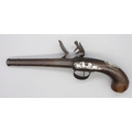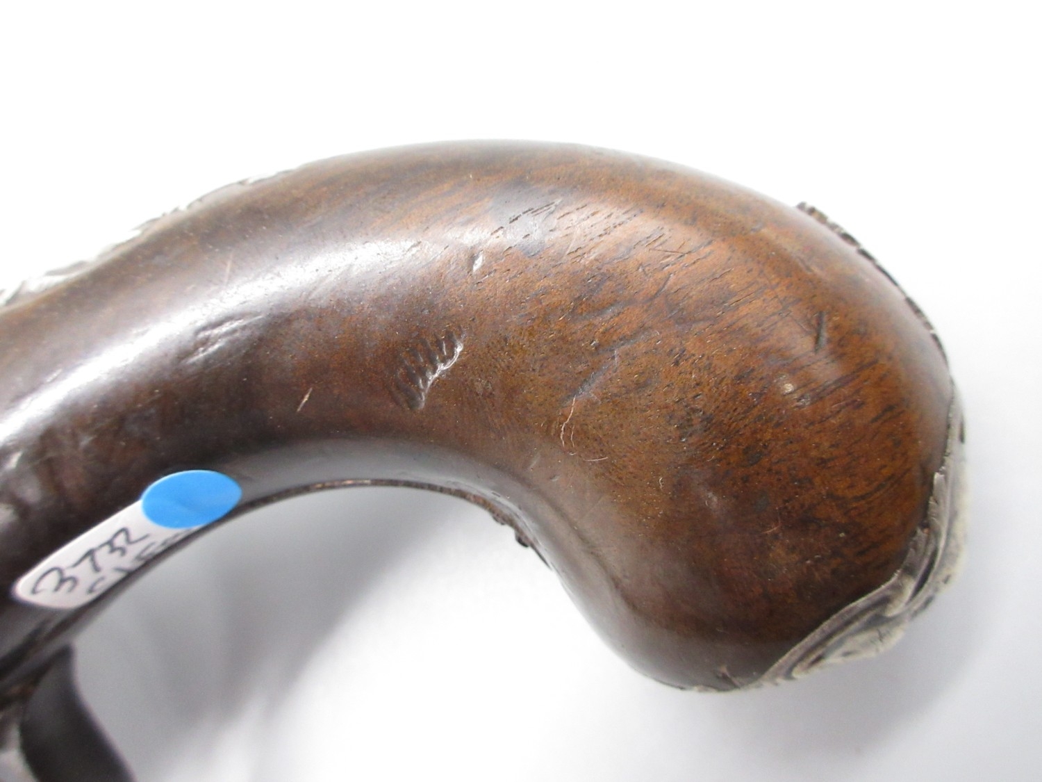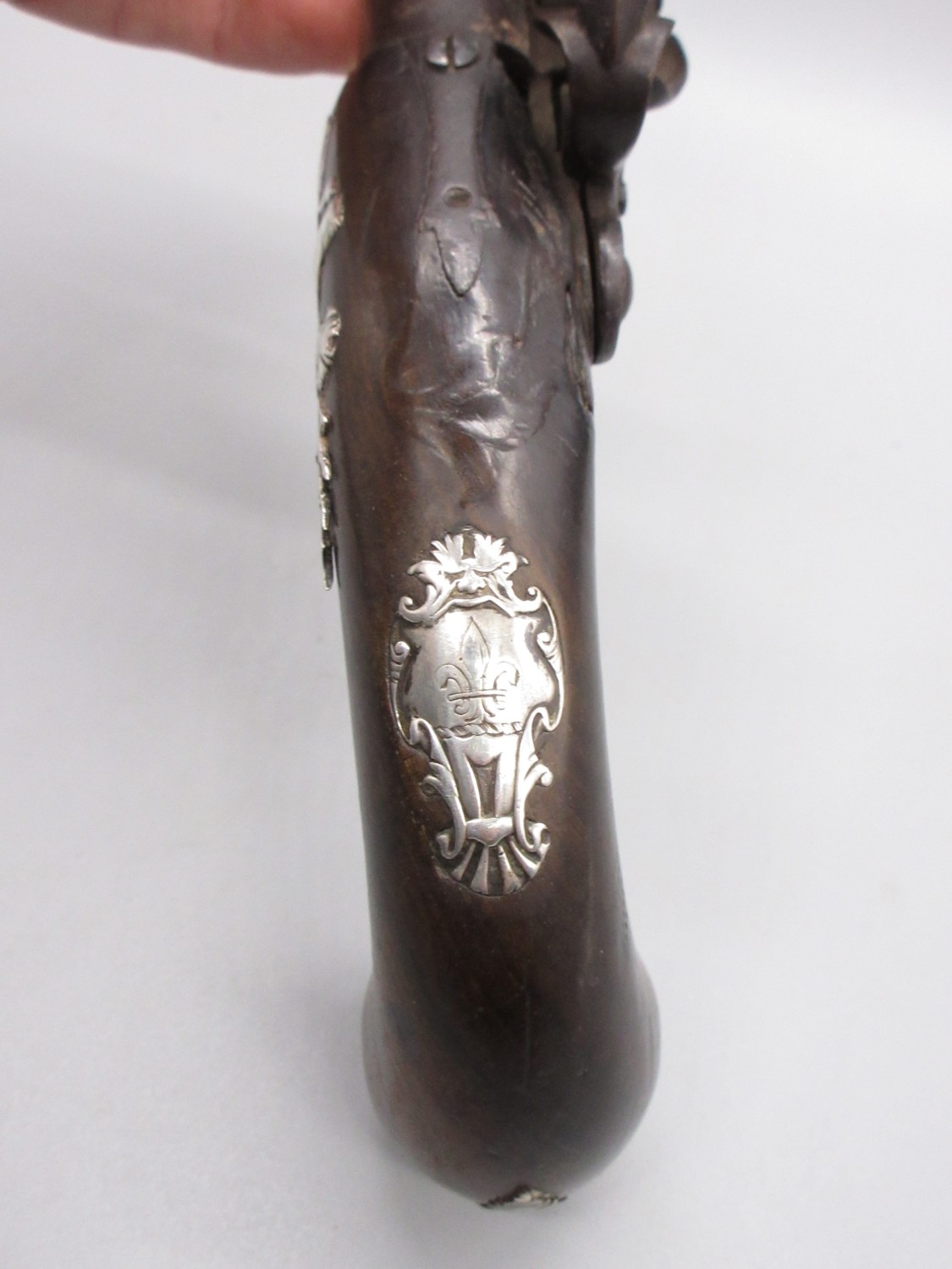 Pair of Queen Anne 20 bore flintlock cannon barrel pistols by `Hawks of Oxford', 6" staged cannon barrels, stamped proof marks, faint makers details, white metal mounts and grotesque face mask butt caps, 30cm overall.