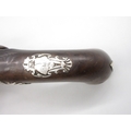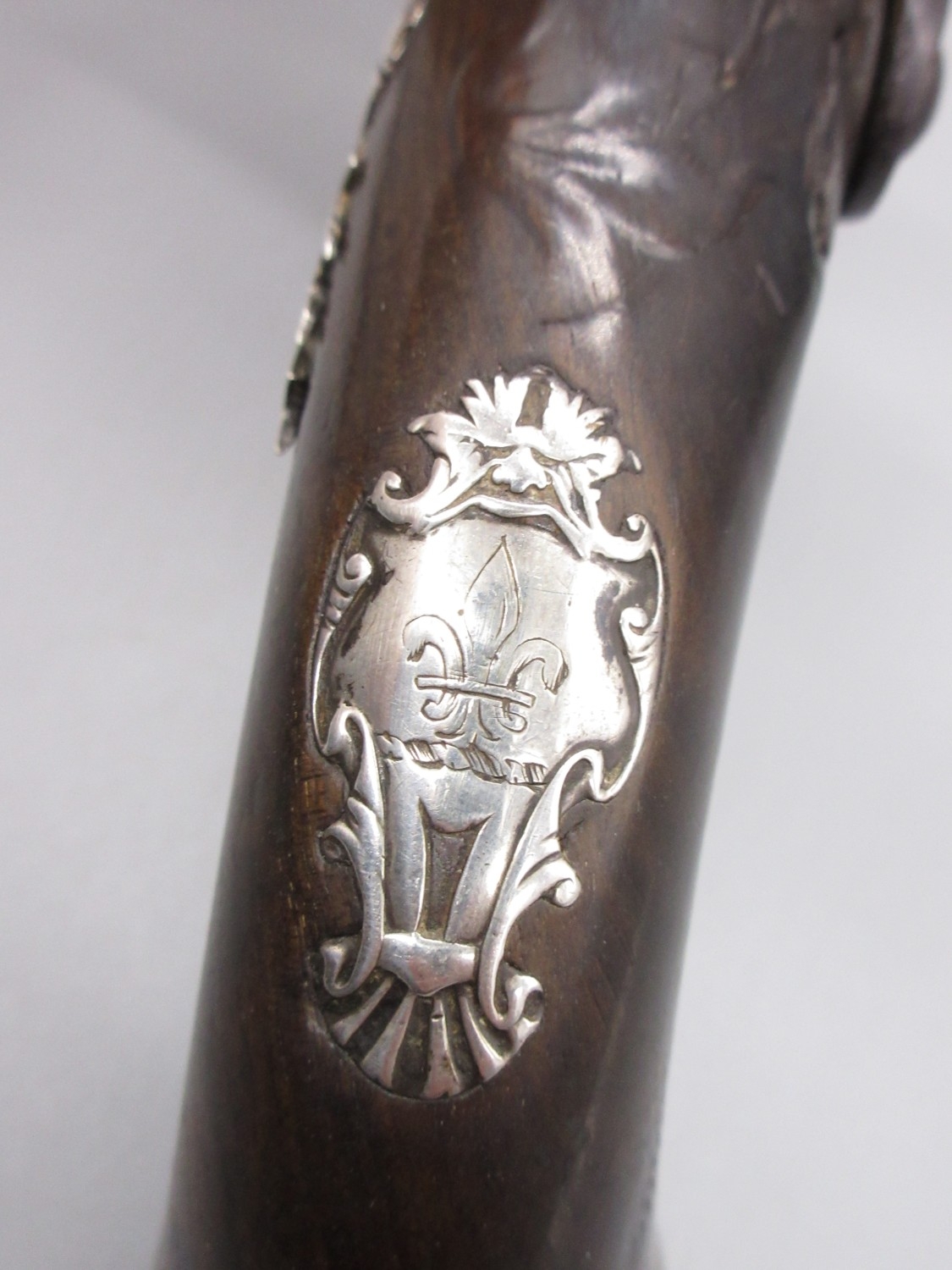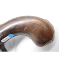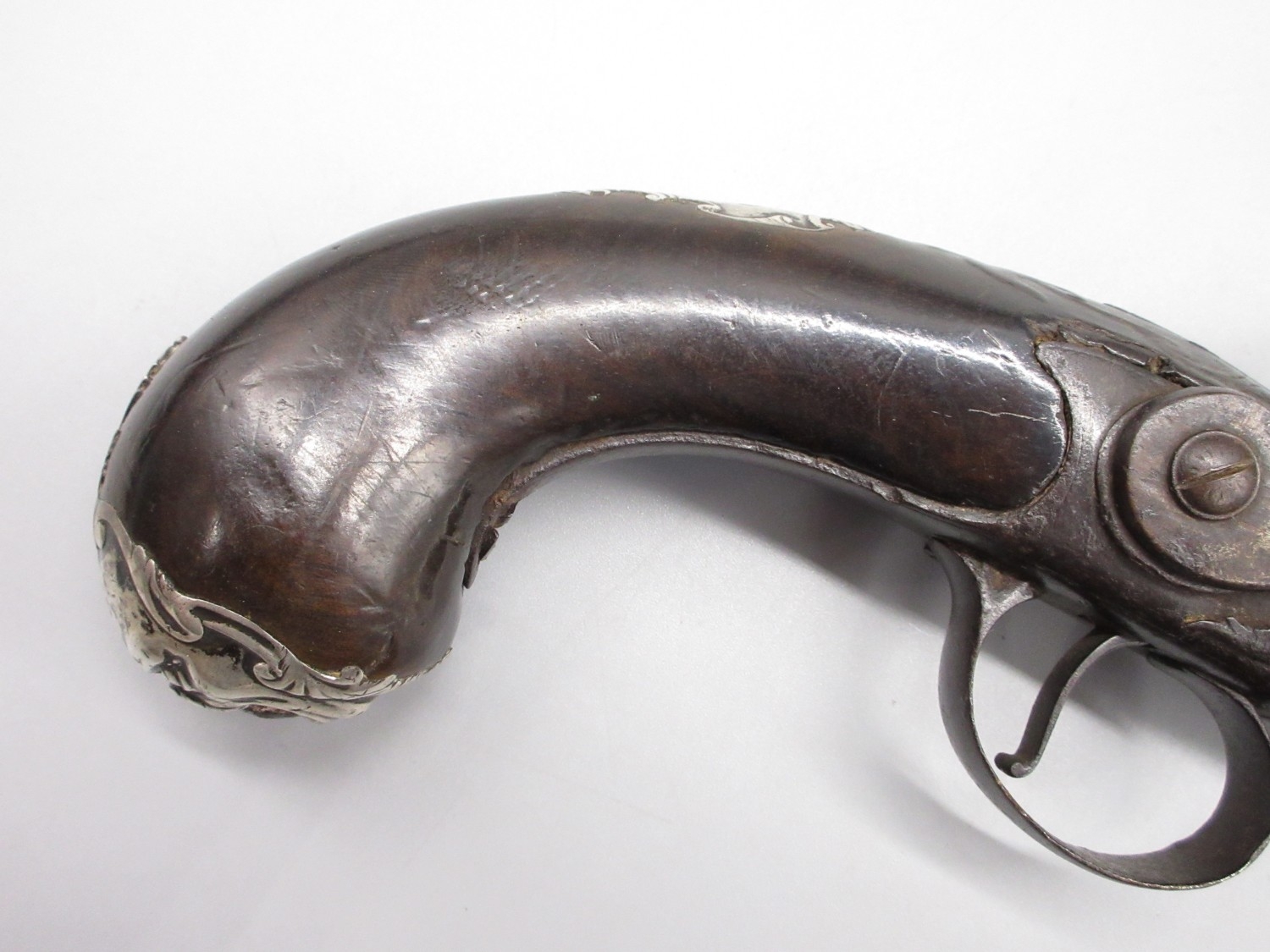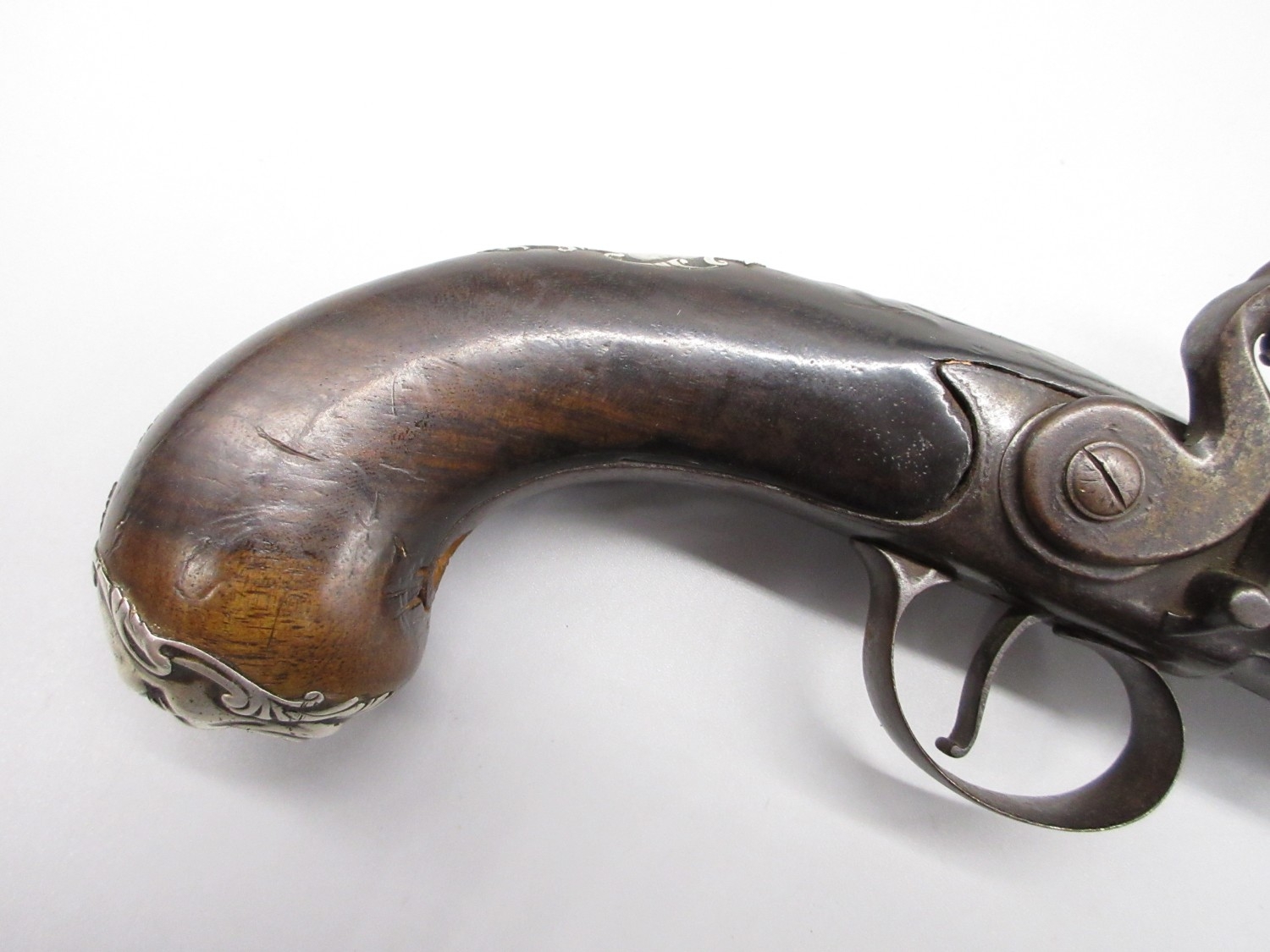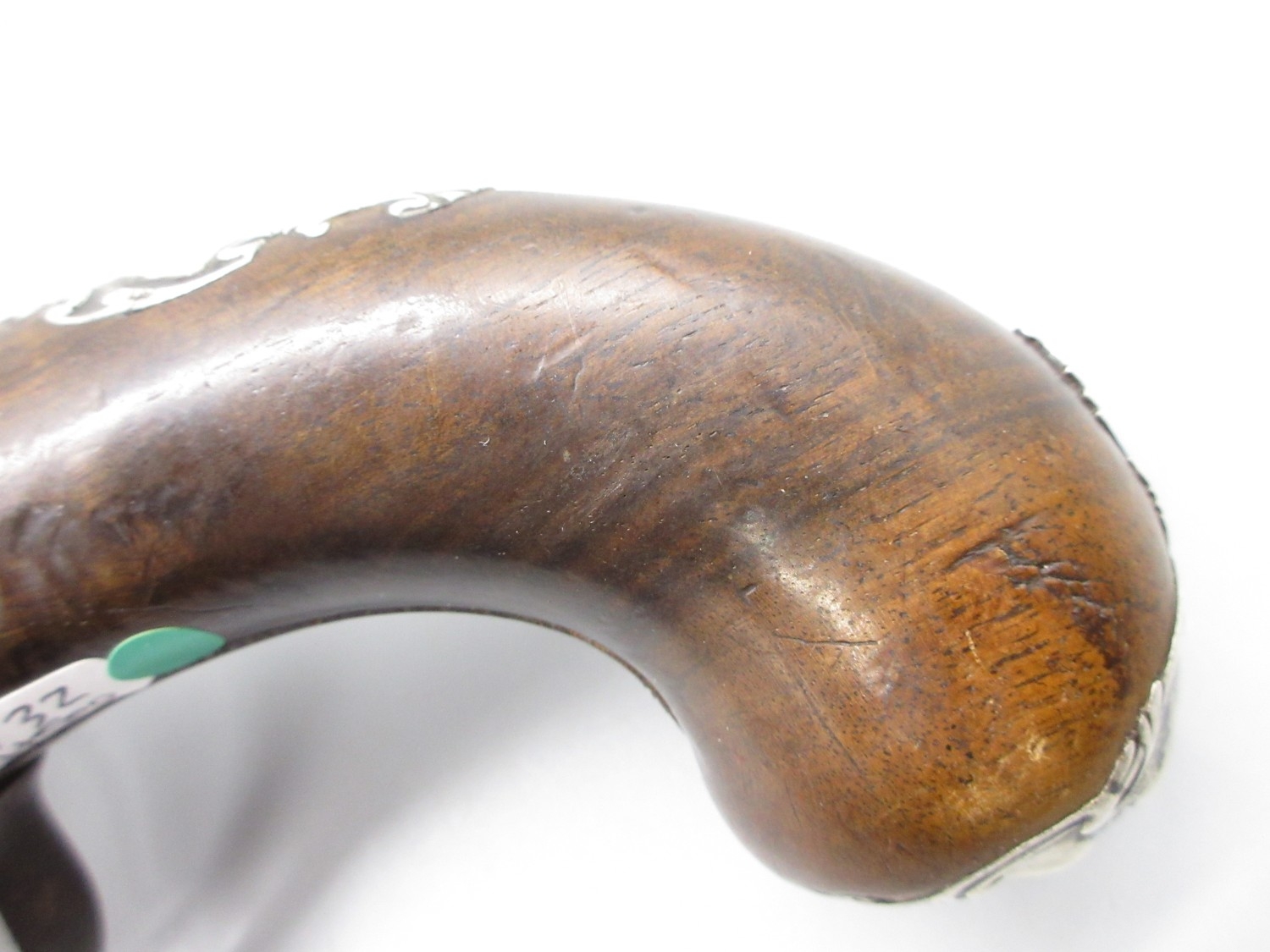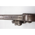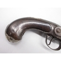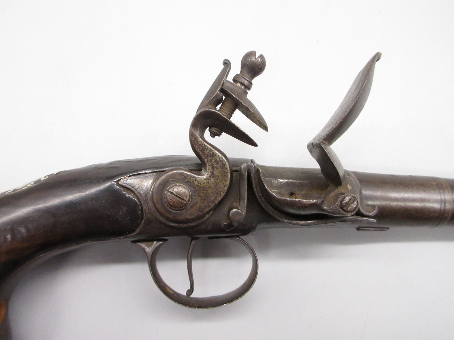 Pair of Queen Anne 20 bore flintlock cannon barrel pistols by `Hawks of Oxford', 6" staged cannon barrels, stamped proof marks, faint makers details, white metal mounts and grotesque face mask butt caps, 30cm overall.