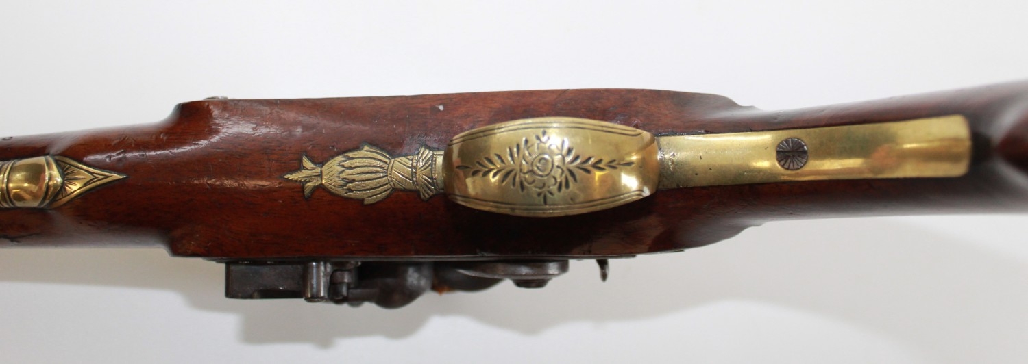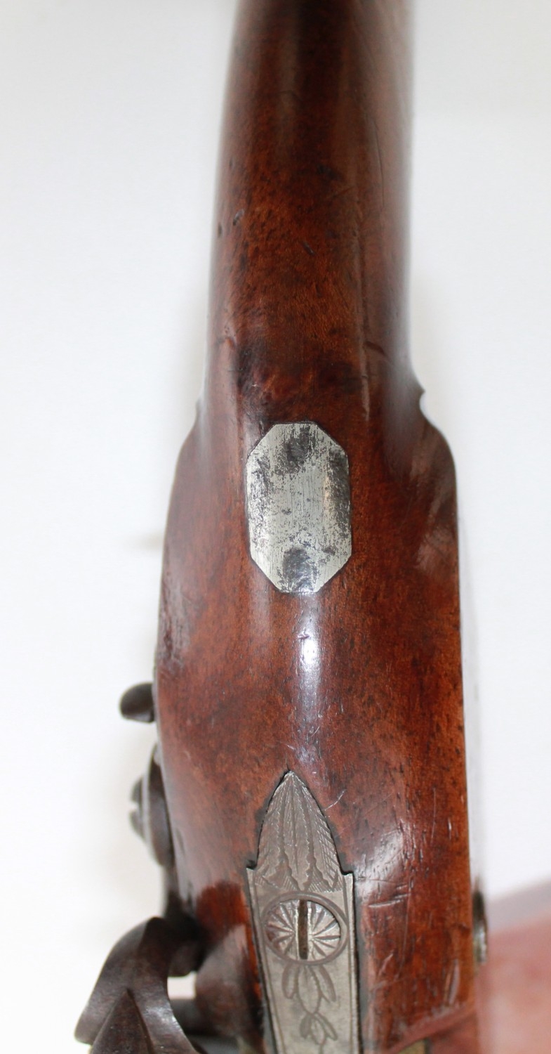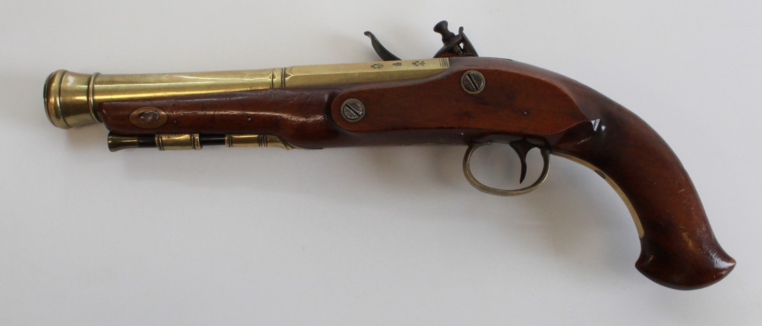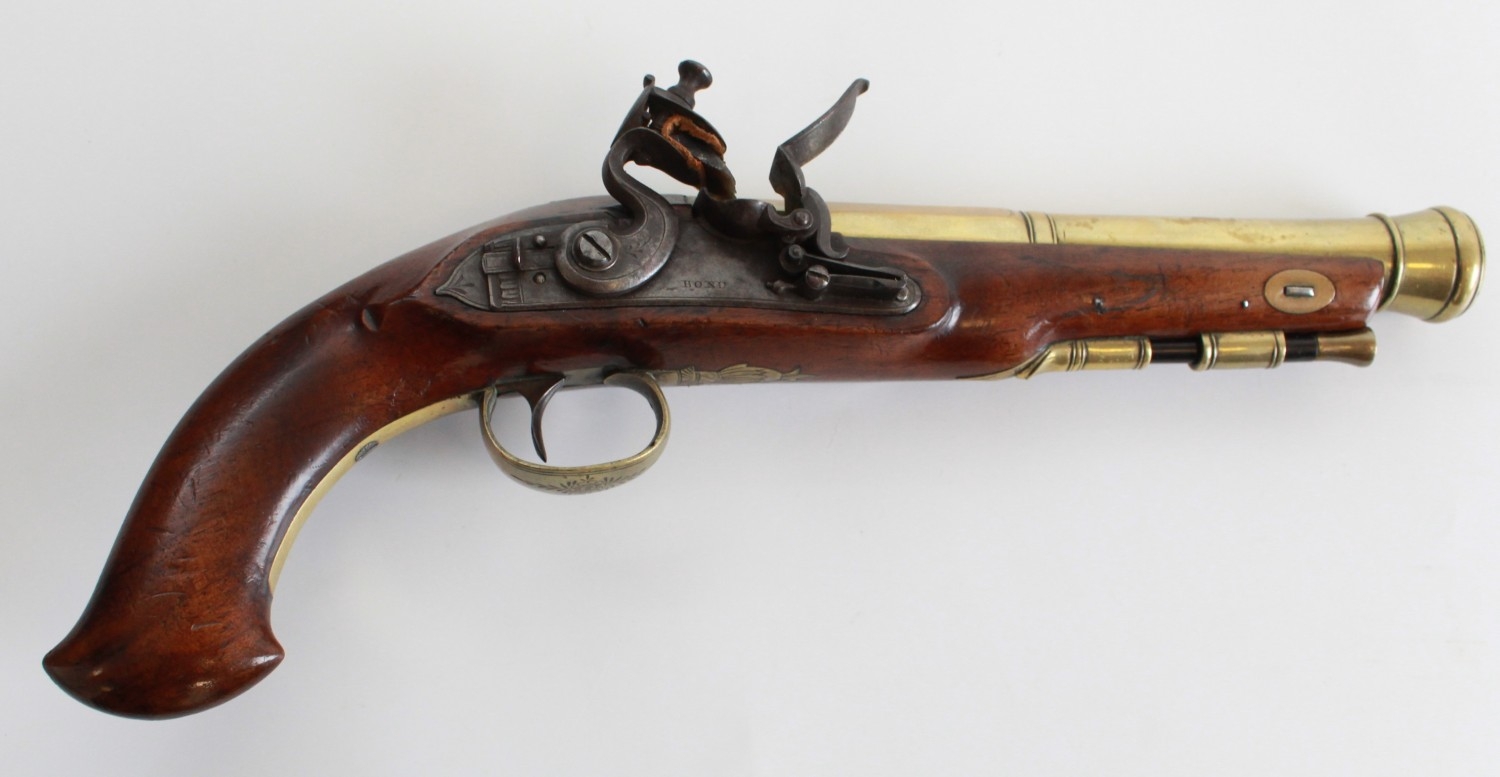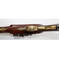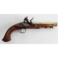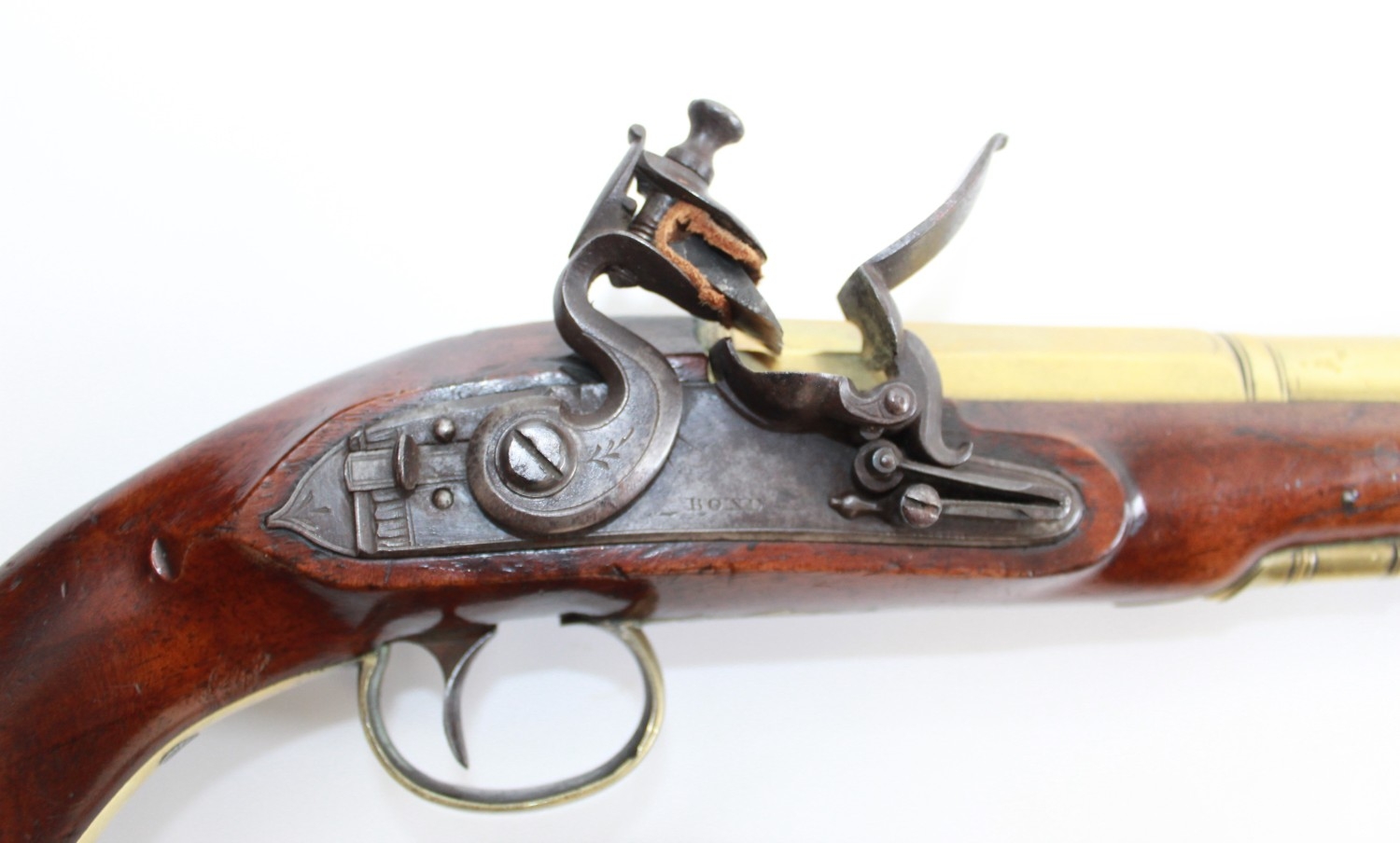 Late 18th century brass barrelled blunderbuss flintlock pistol by Bond, London, 8" first stage octagonal cannon barrel, top flat engraved 'London', side safety, action named 'Bond' complete with ramrod, 36cm overall