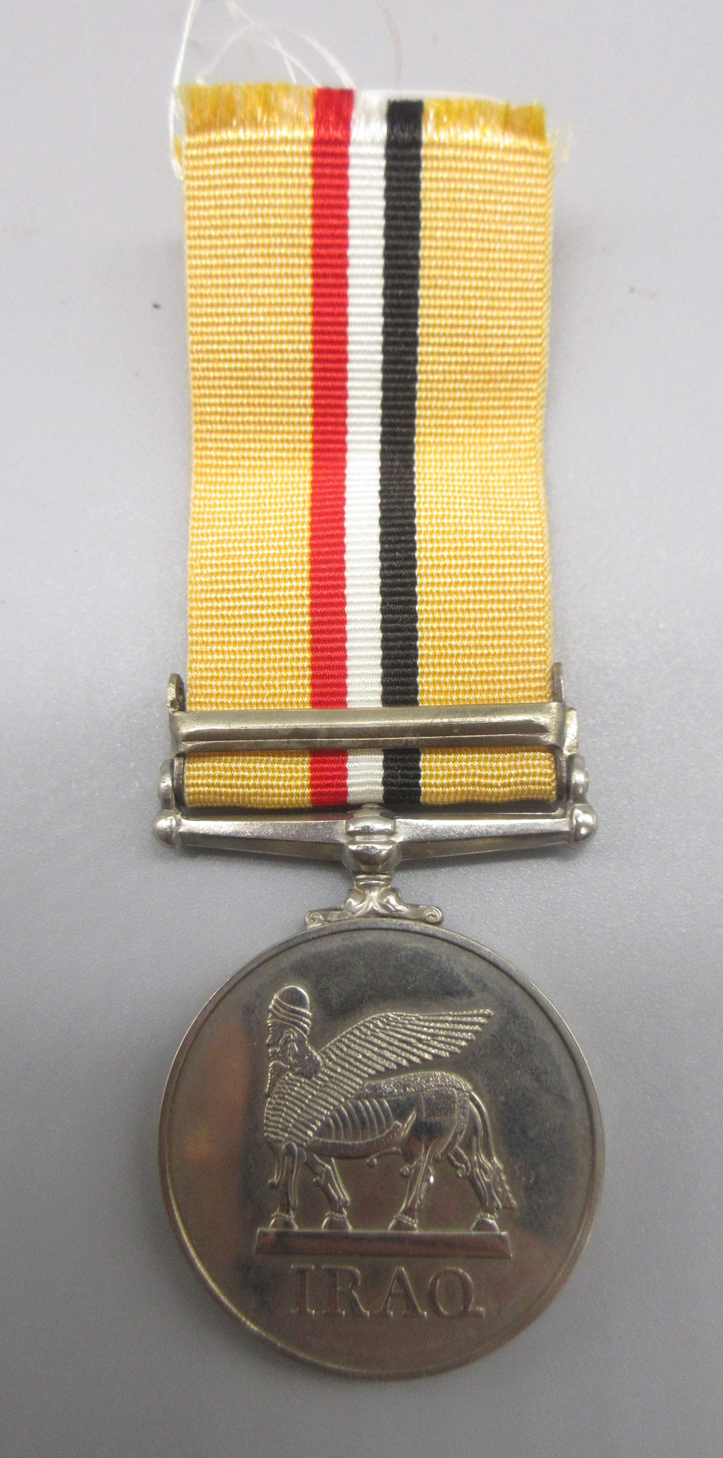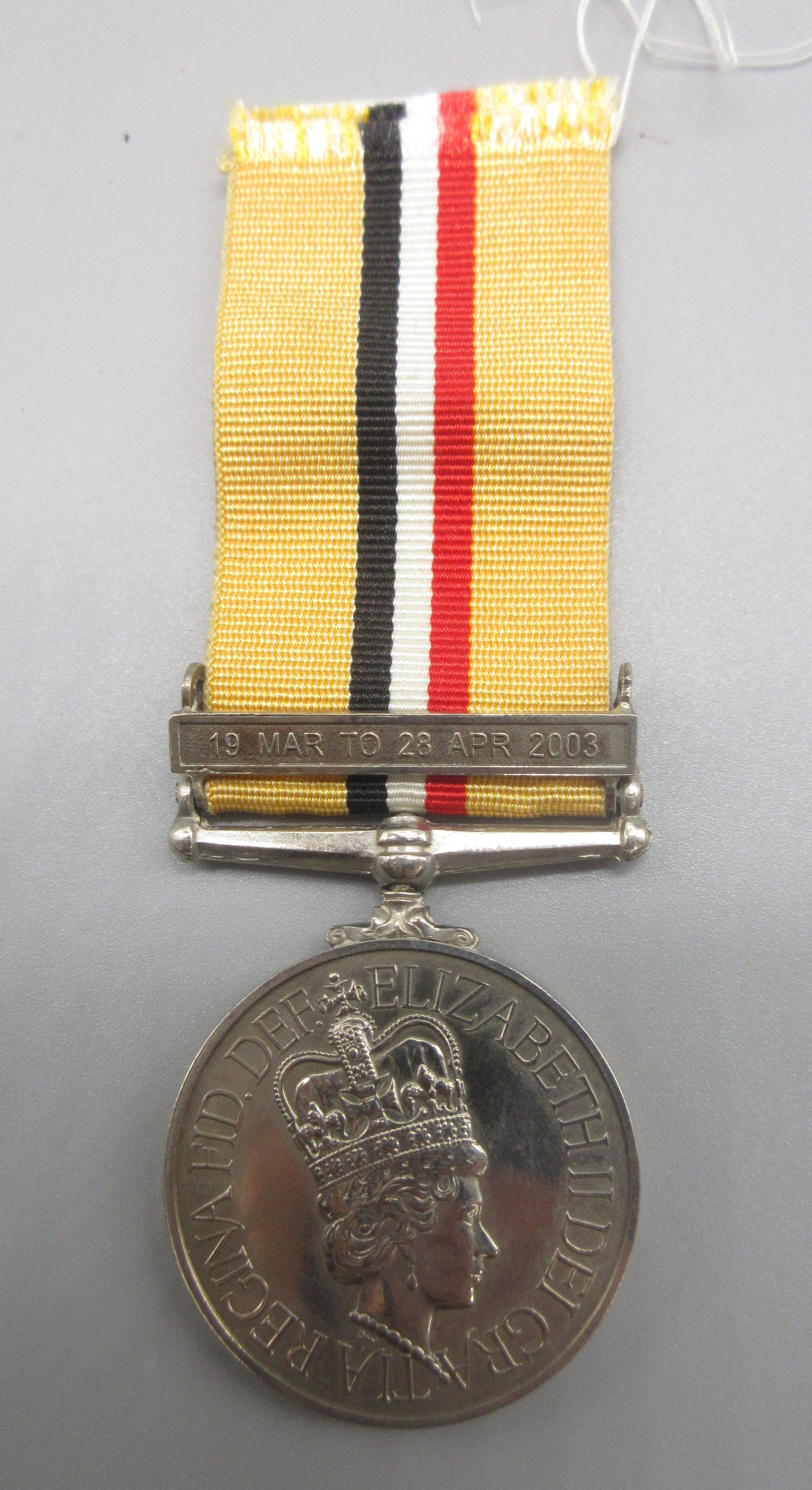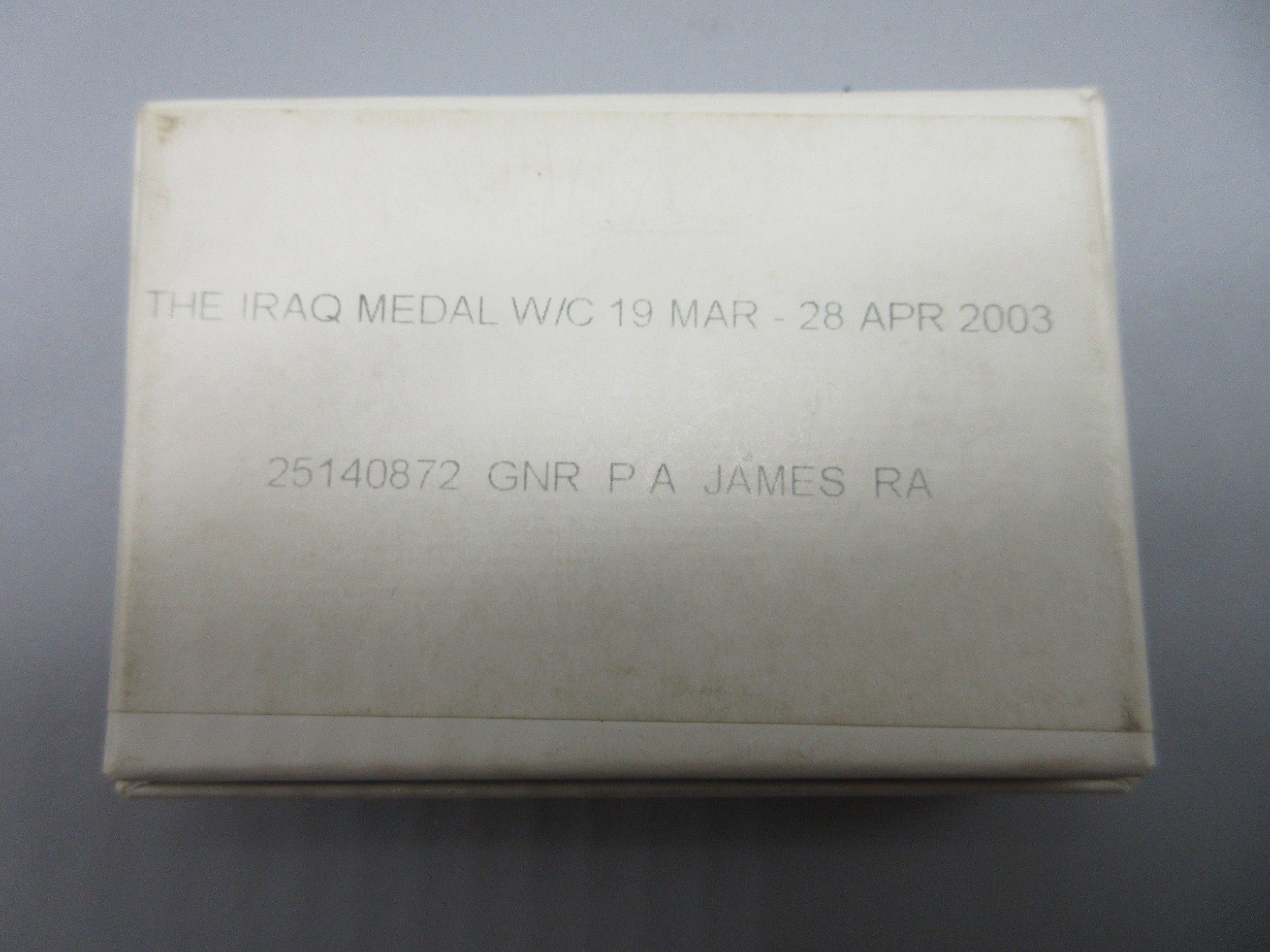 Iraq Medal with clasp 19 March to 28th April 2003 To. 25140872 Gnr. P. A. James RA, with rosette, this medal was awarded to all military and civilian personnel involved in Operation TELIC in Kuwait and Iraq from January 2003