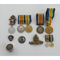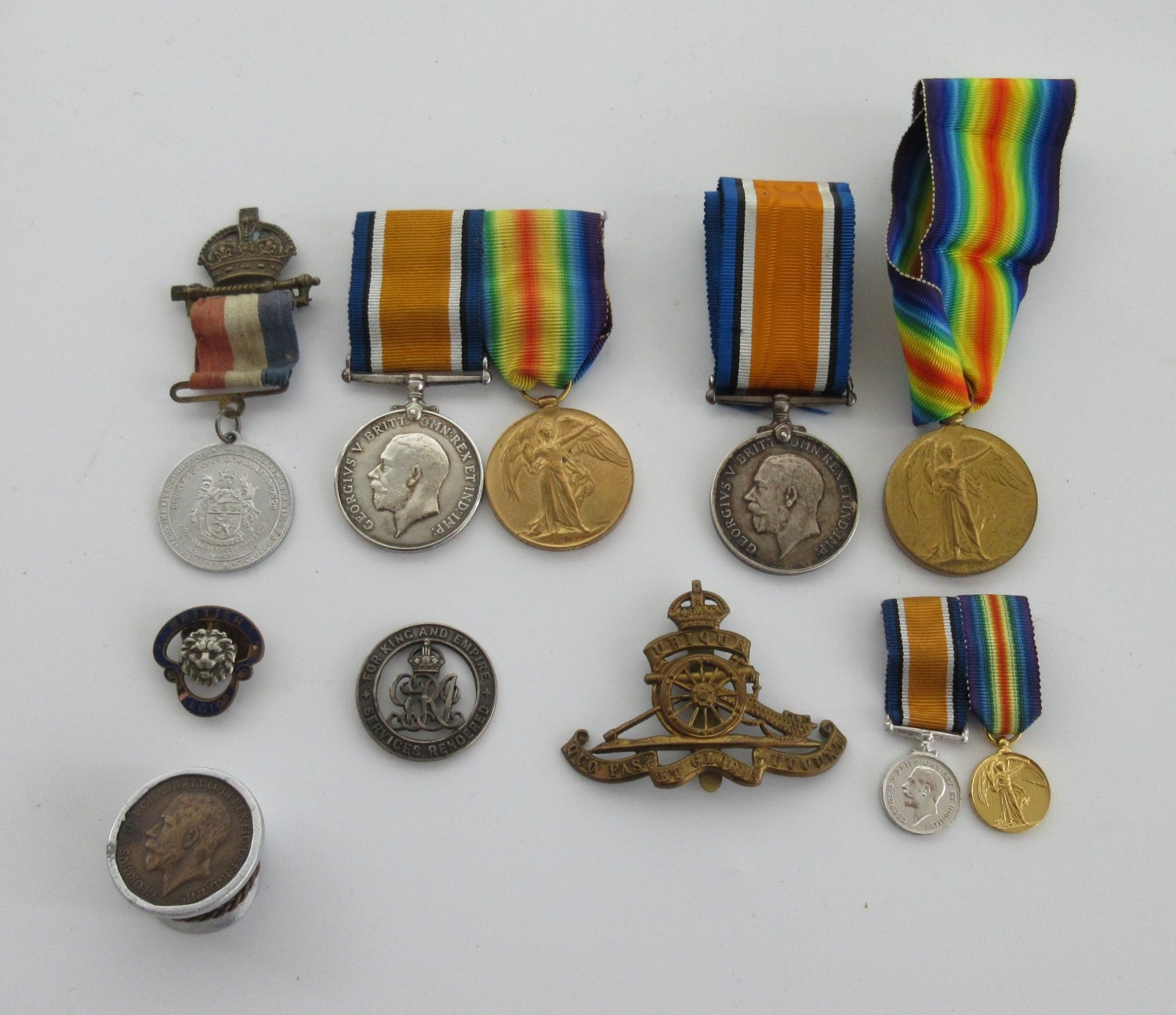 Small collection of WWI Medals and badges, Victory Medal, 1914-18 War Medal To S-10796 Pte J. Perry Rifle Brigade. Victory Medal, 1914-18 War Medal To 40932 Pte S. Duffy Yorkshire Light Infantry, with miniatures, R.A. cap badge, trench art cap etc.